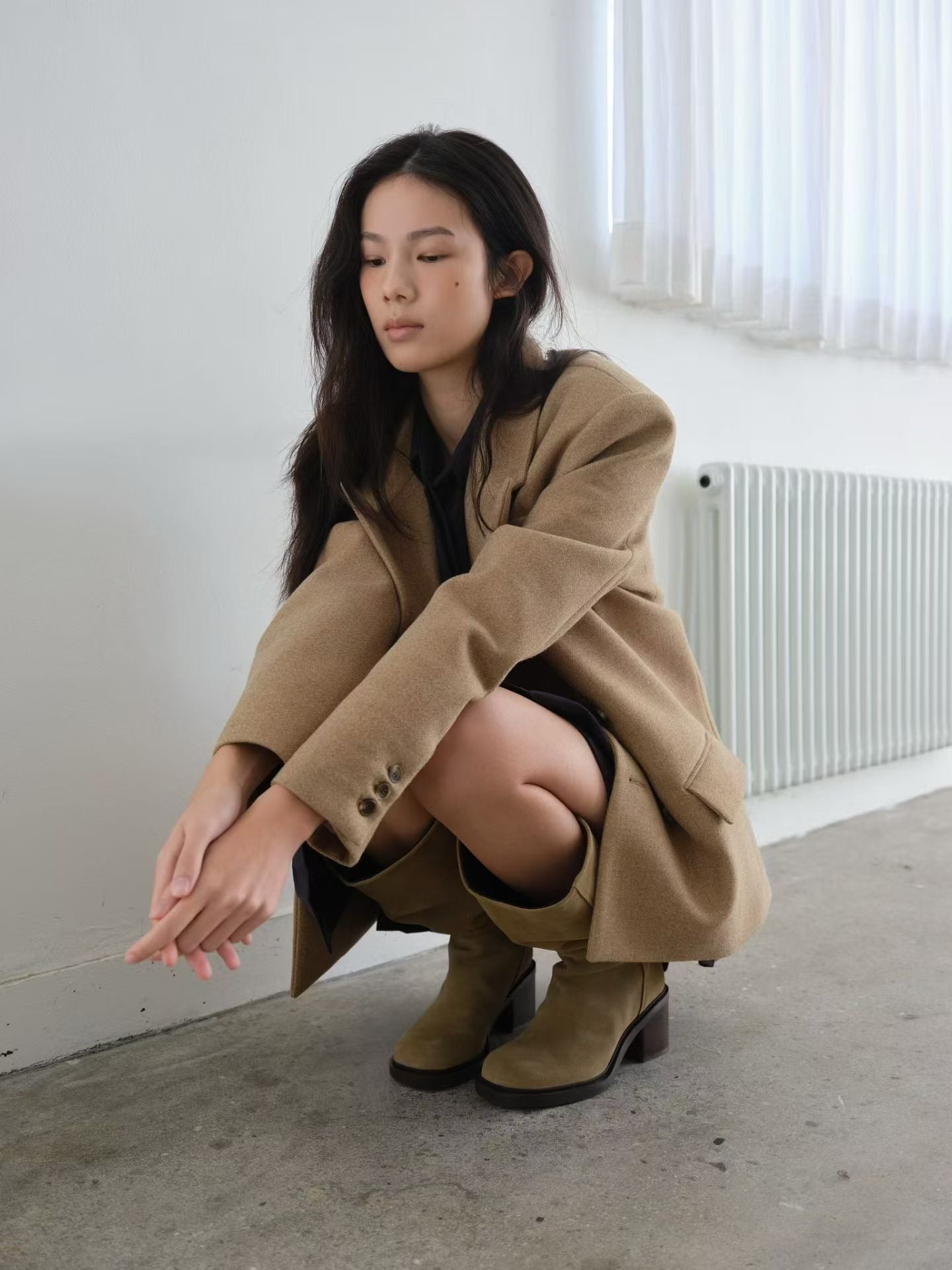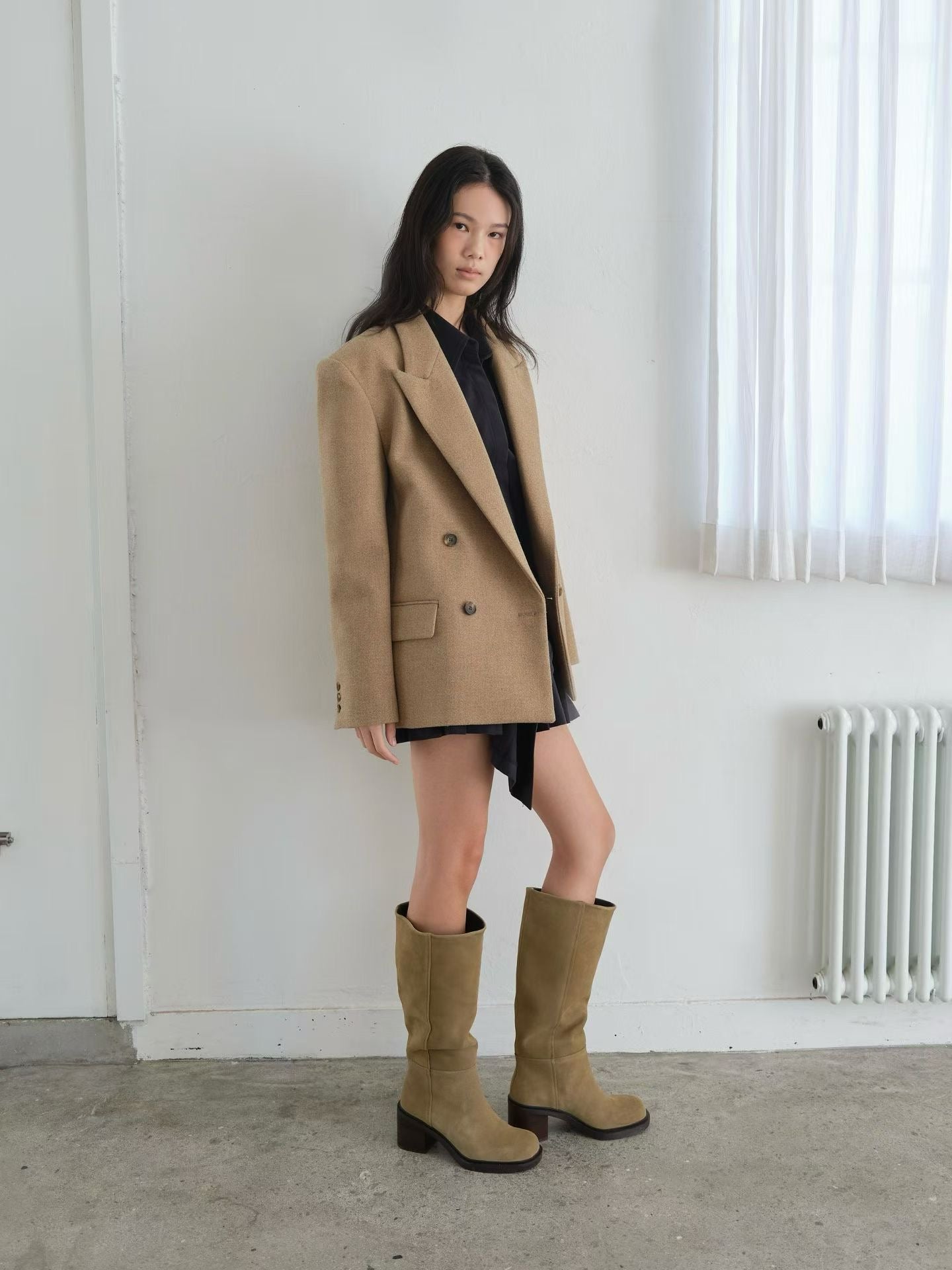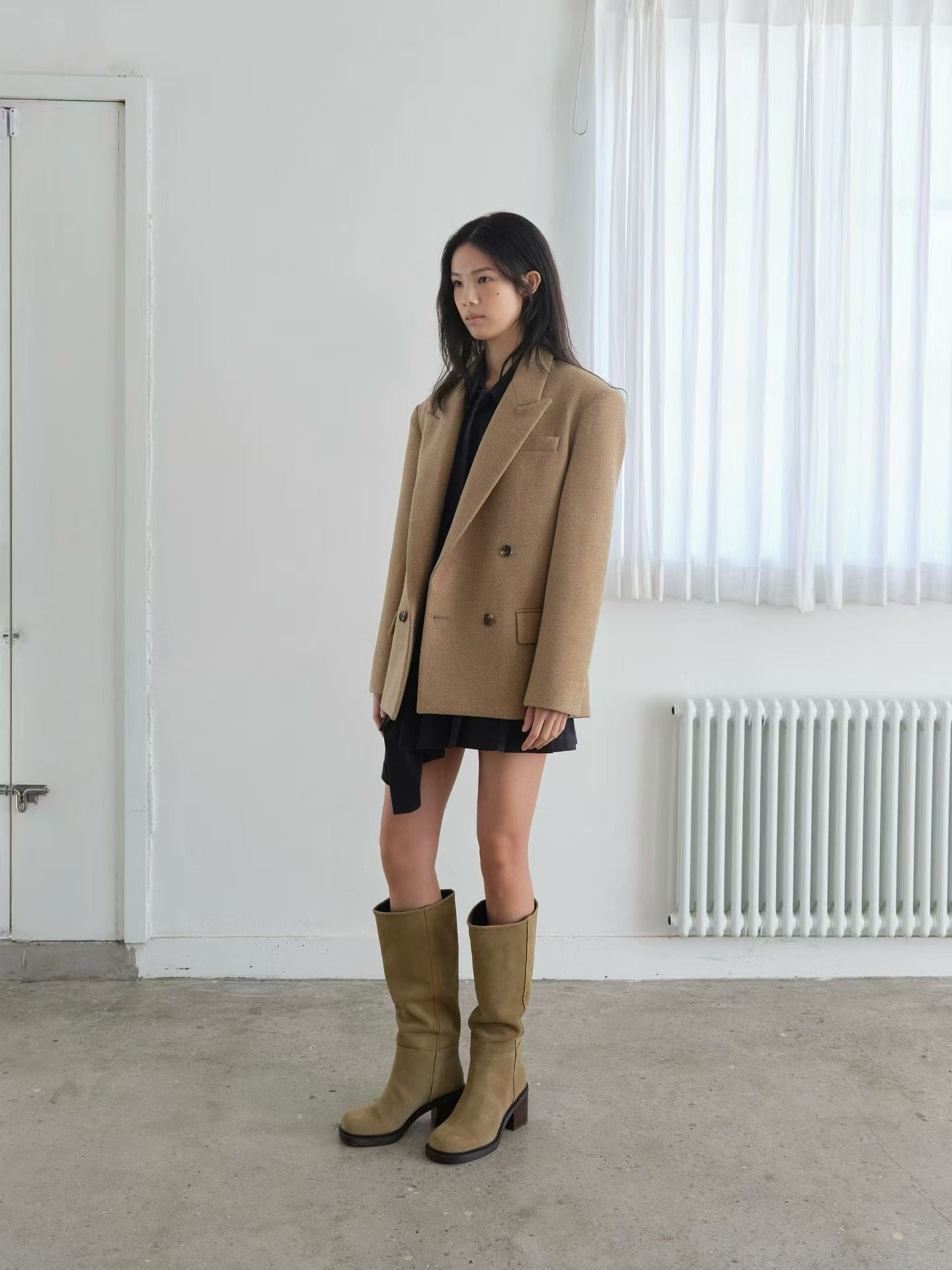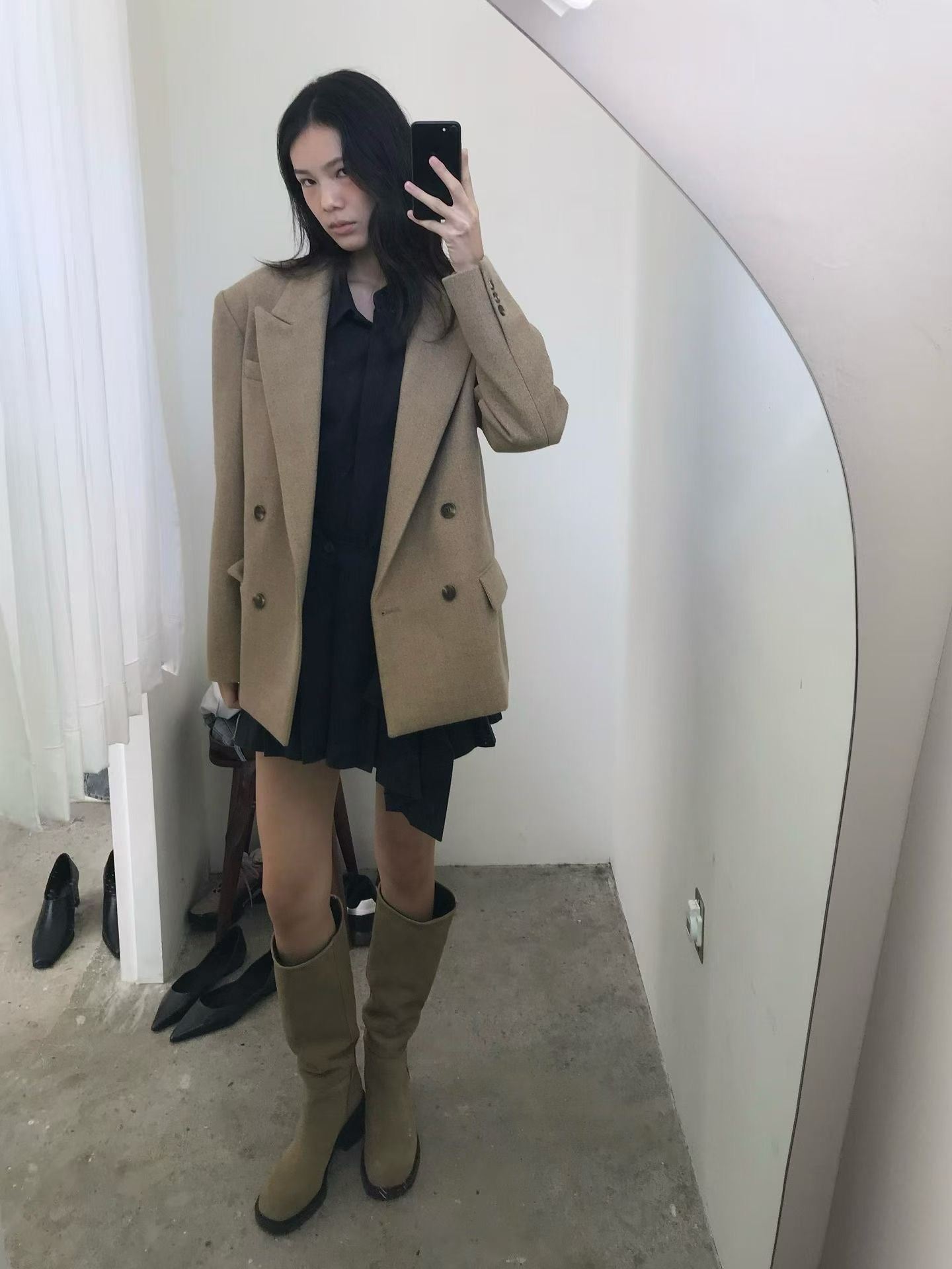 這款寬肩雙排釦毛呢西裝外套,是為追求強大氣場與秋冬溫暖感的你而設計。它將經典的西裝廓形與厚實的毛呢材質完美融合,輕鬆穿出毫不費力的韓系高級感。