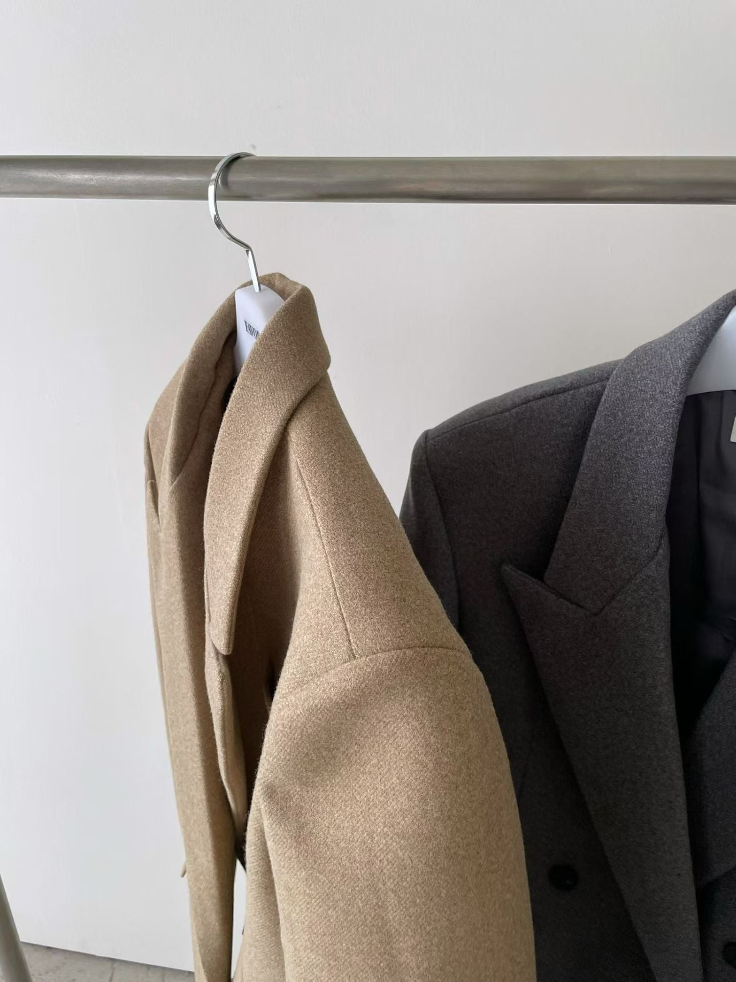 設計與質感: 外套採用混紡毛呢面料,觸感溫暖舒適,是秋冬季節增添層次感的理想單品。經典的雙排釦設計與大翻領,充滿復古紳士的知性氣息。寬肩Oversized剪裁是這款外套的靈魂,它能瞬間提升你的氣場,完美修飾身形。