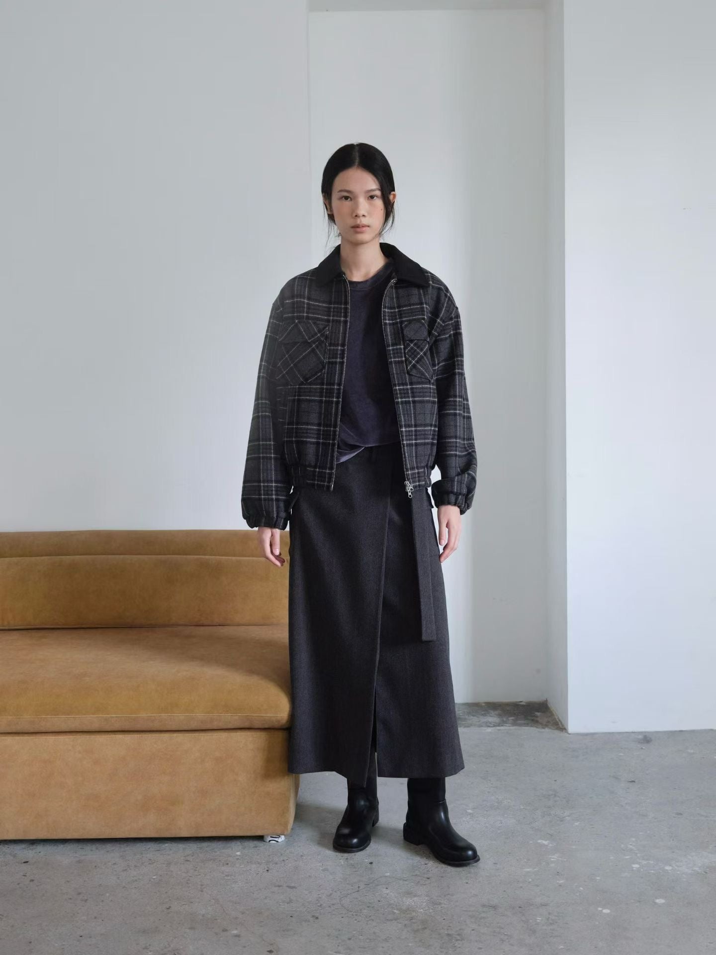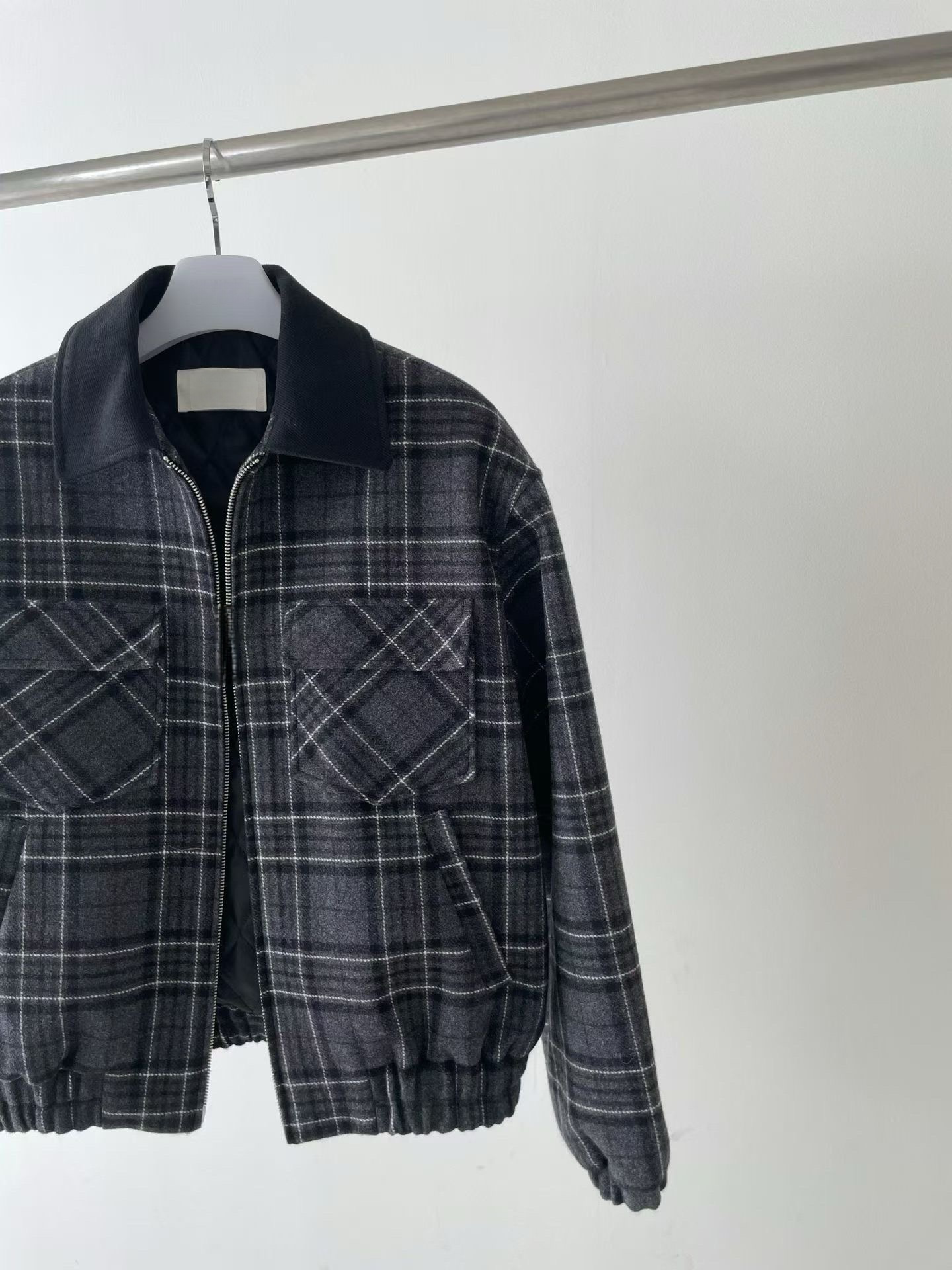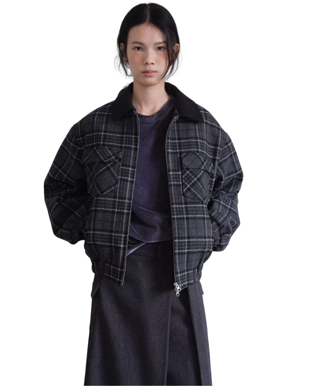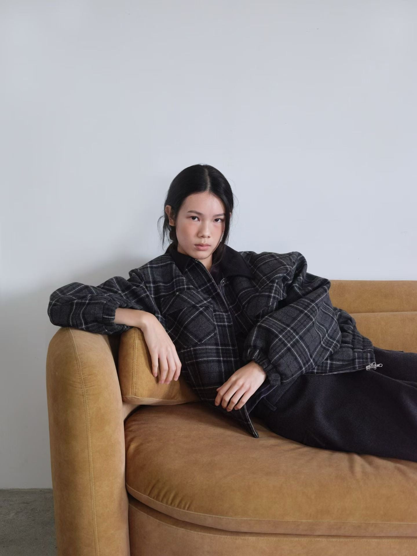 設計與質感: 夾克採用溫暖舒適的毛呢面料,經典的黑灰格紋圖案充滿復古氣息。內裡為菱格紋絎縫設計(Quilted Lining),提供優異的保暖性與舒適度。外套採用短版寬鬆剪裁,巧妙拉高腰線,視覺上極為顯高顯瘦。