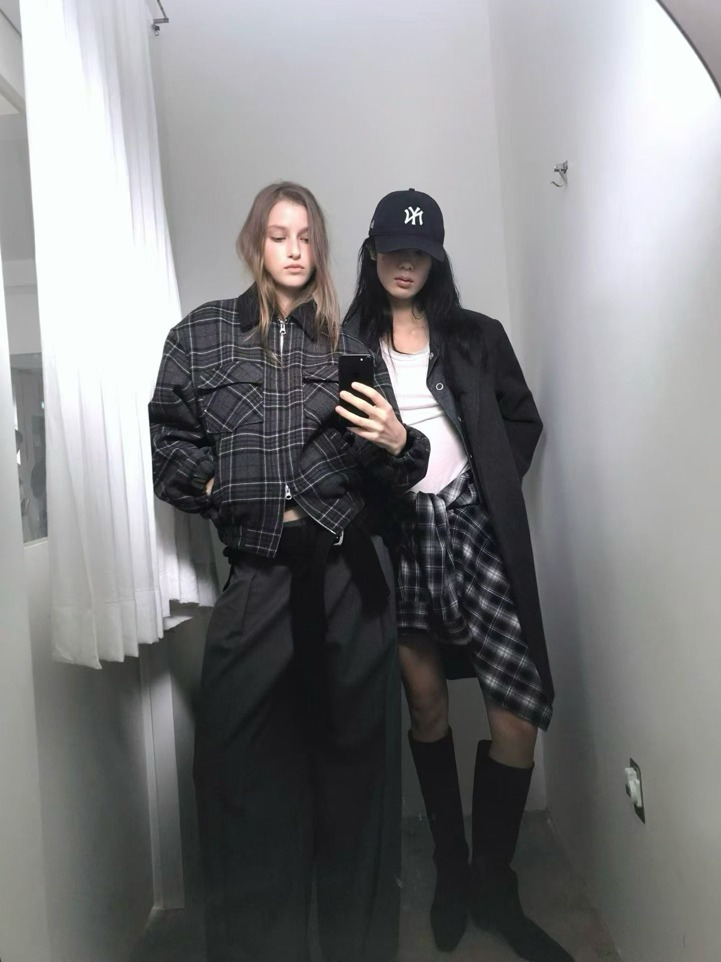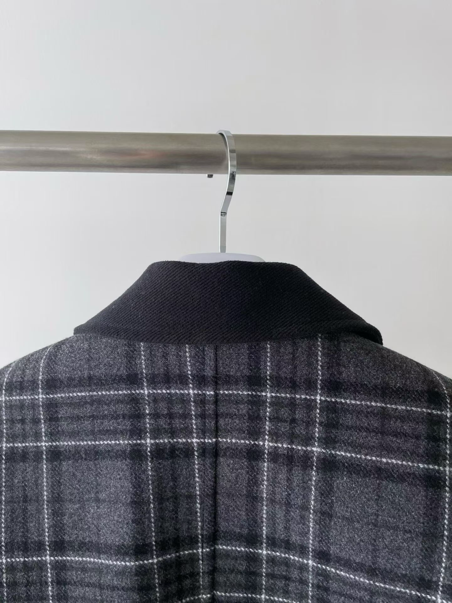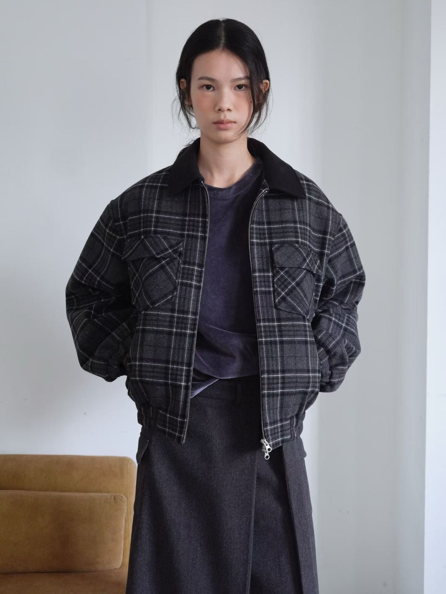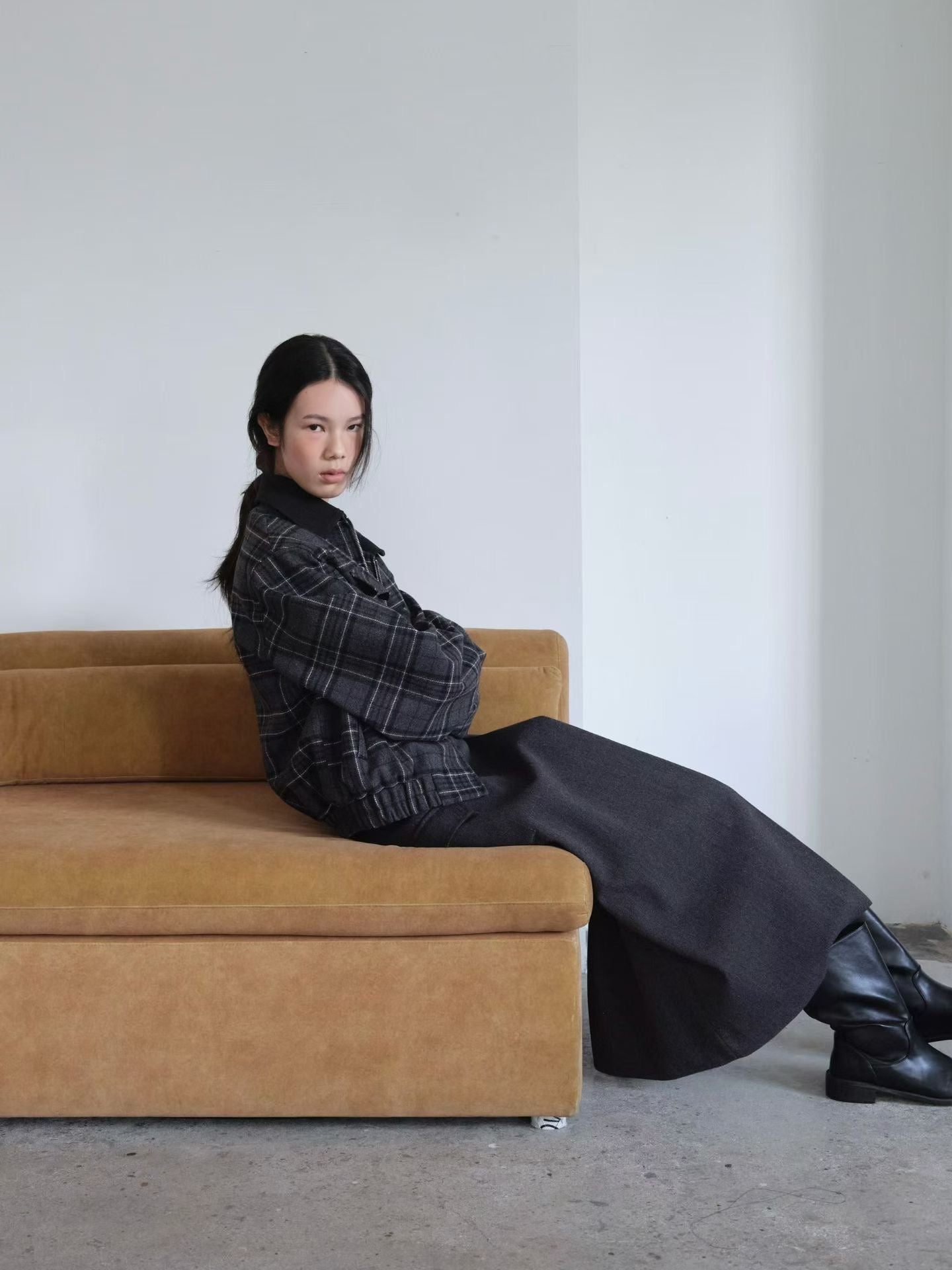 設計與質感: 夾克採用溫暖舒適的毛呢面料,經典的黑灰格紋圖案充滿復古氣息。內裡為菱格紋絎縫設計(Quilted Lining),提供優異的保暖性與舒適度。外套採用短版寬鬆剪裁,巧妙拉高腰線,視覺上極為顯高顯瘦。
