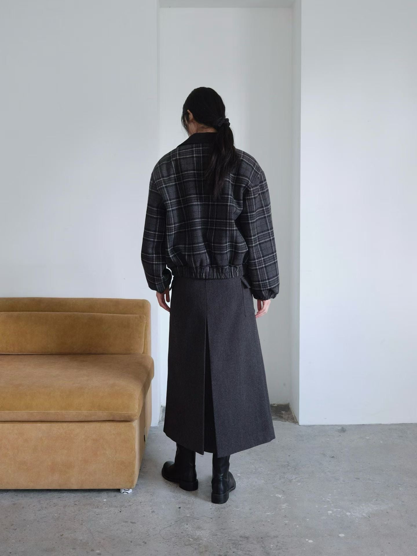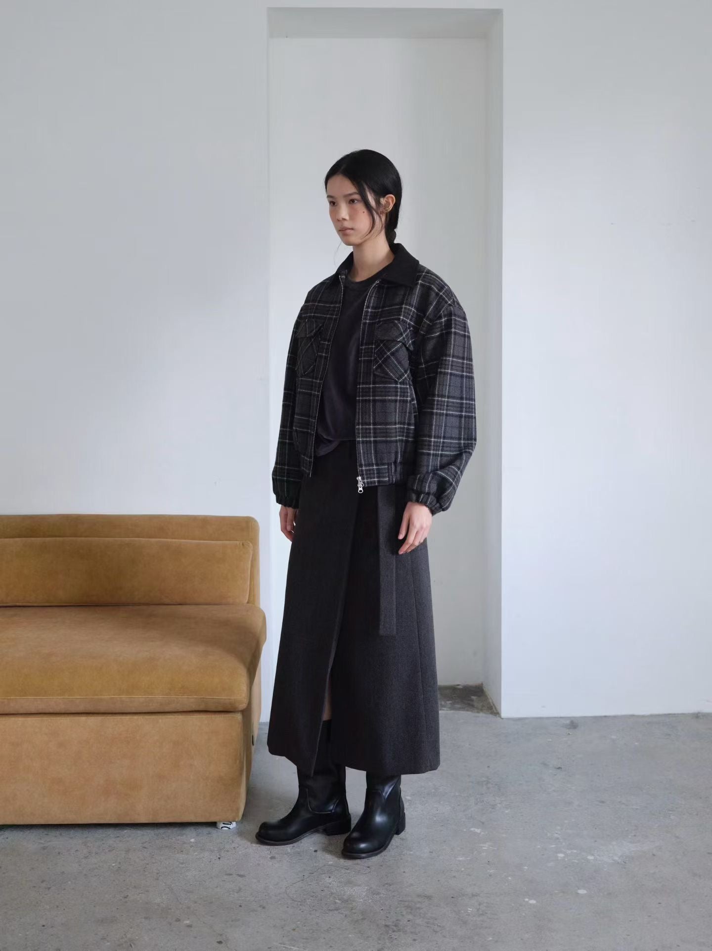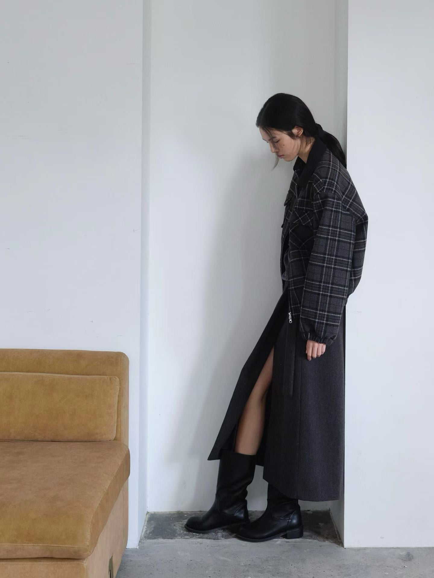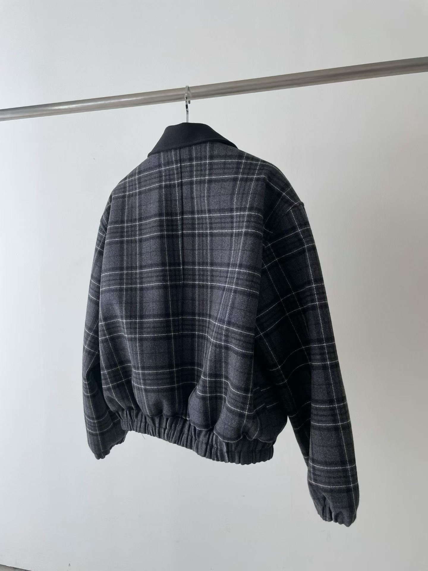 設計與質感: 夾克採用溫暖舒適的毛呢面料,經典的黑灰格紋圖案充滿復古氣息。內裡為菱格紋絎縫設計(Quilted Lining),提供優異的保暖性與舒適度。外套採用短版寬鬆剪裁,巧妙拉高腰線,視覺上極為顯高顯瘦。