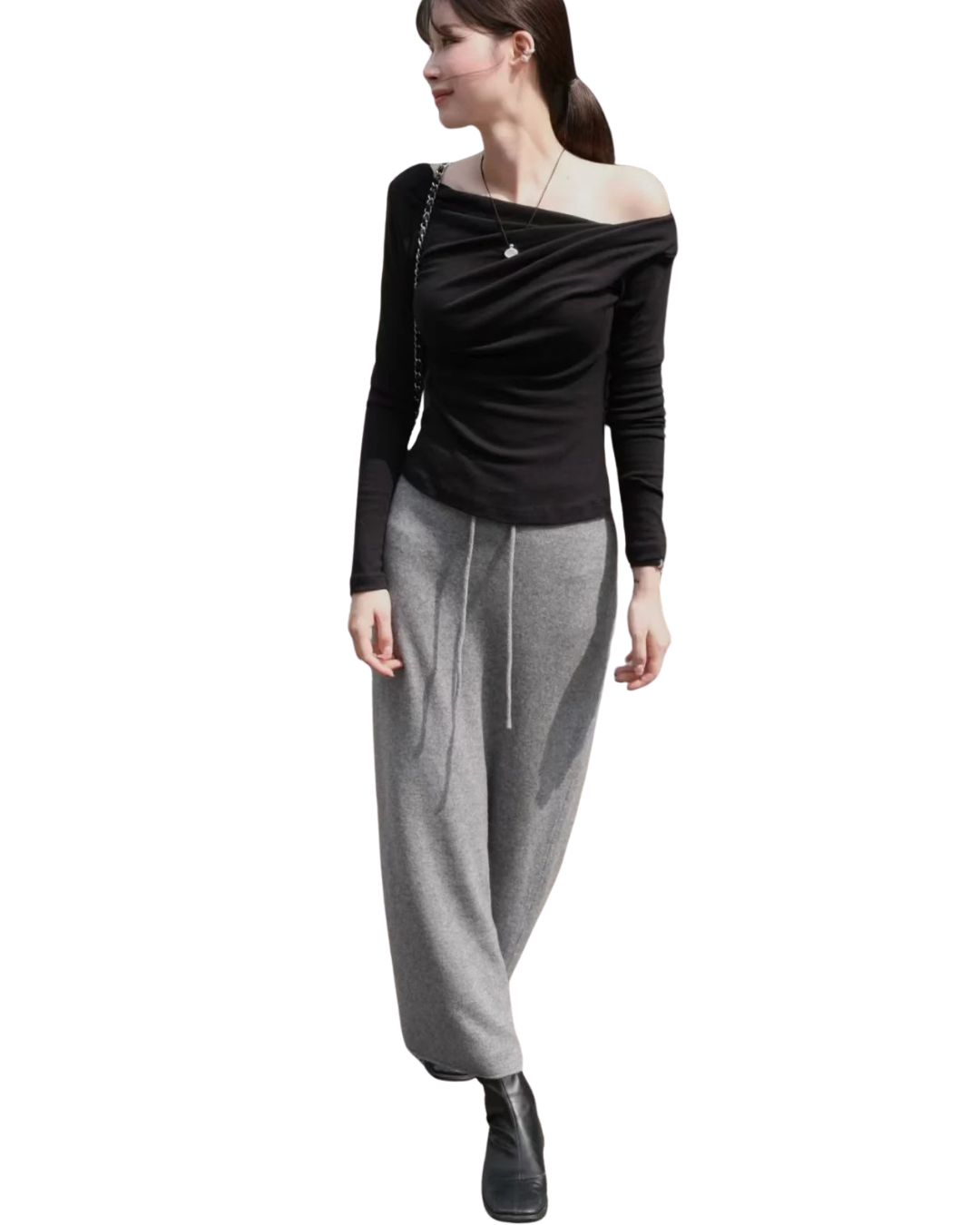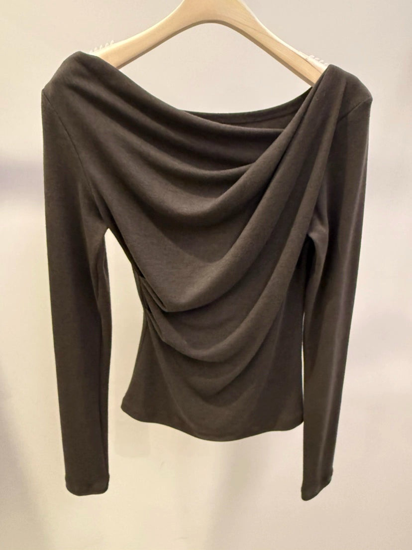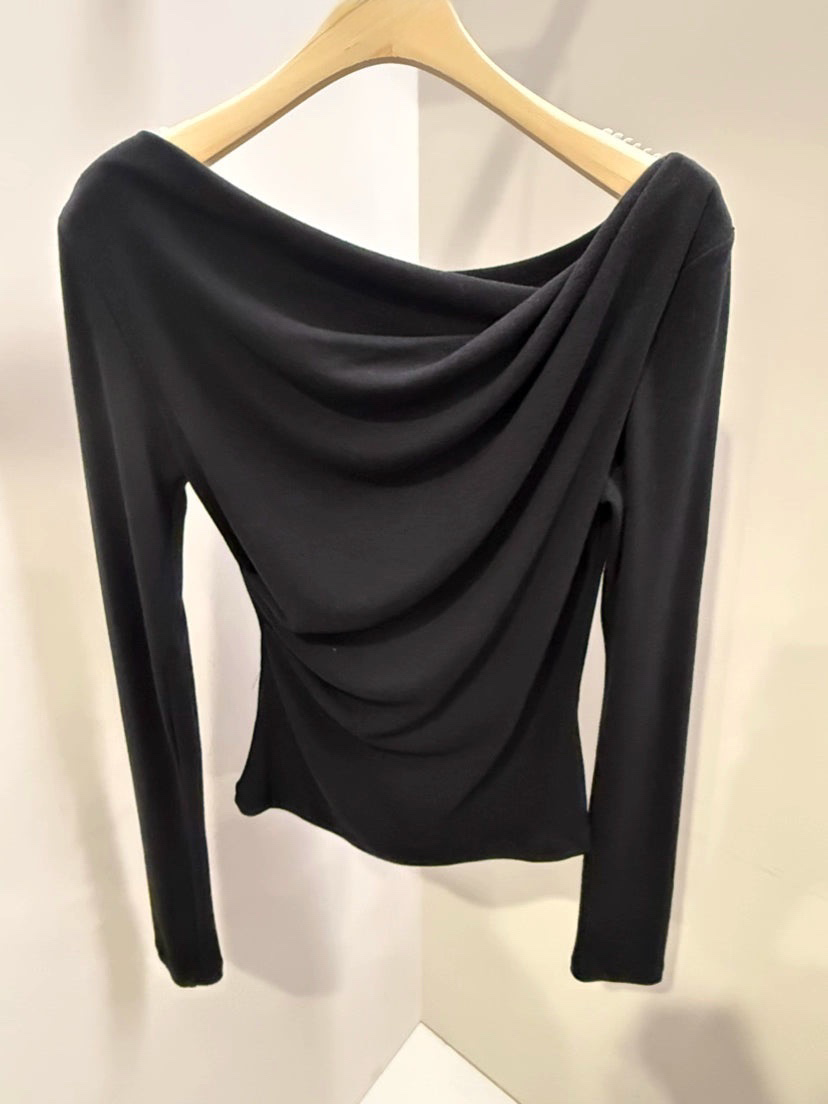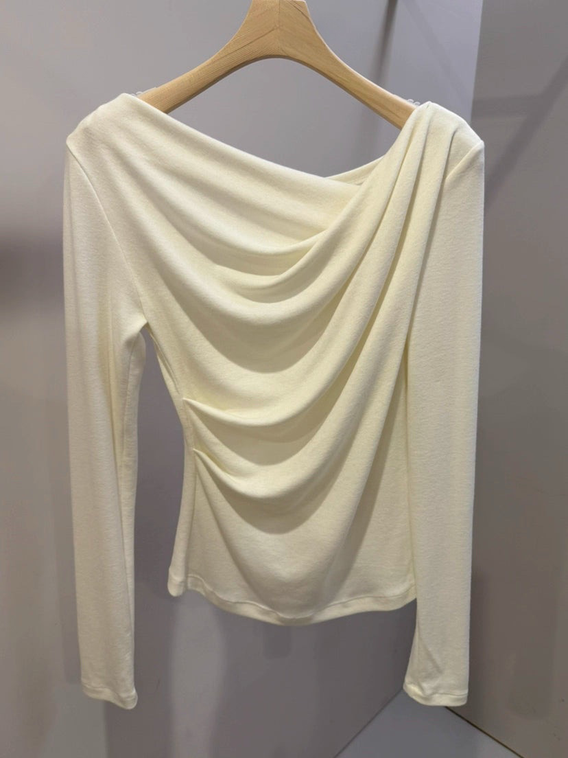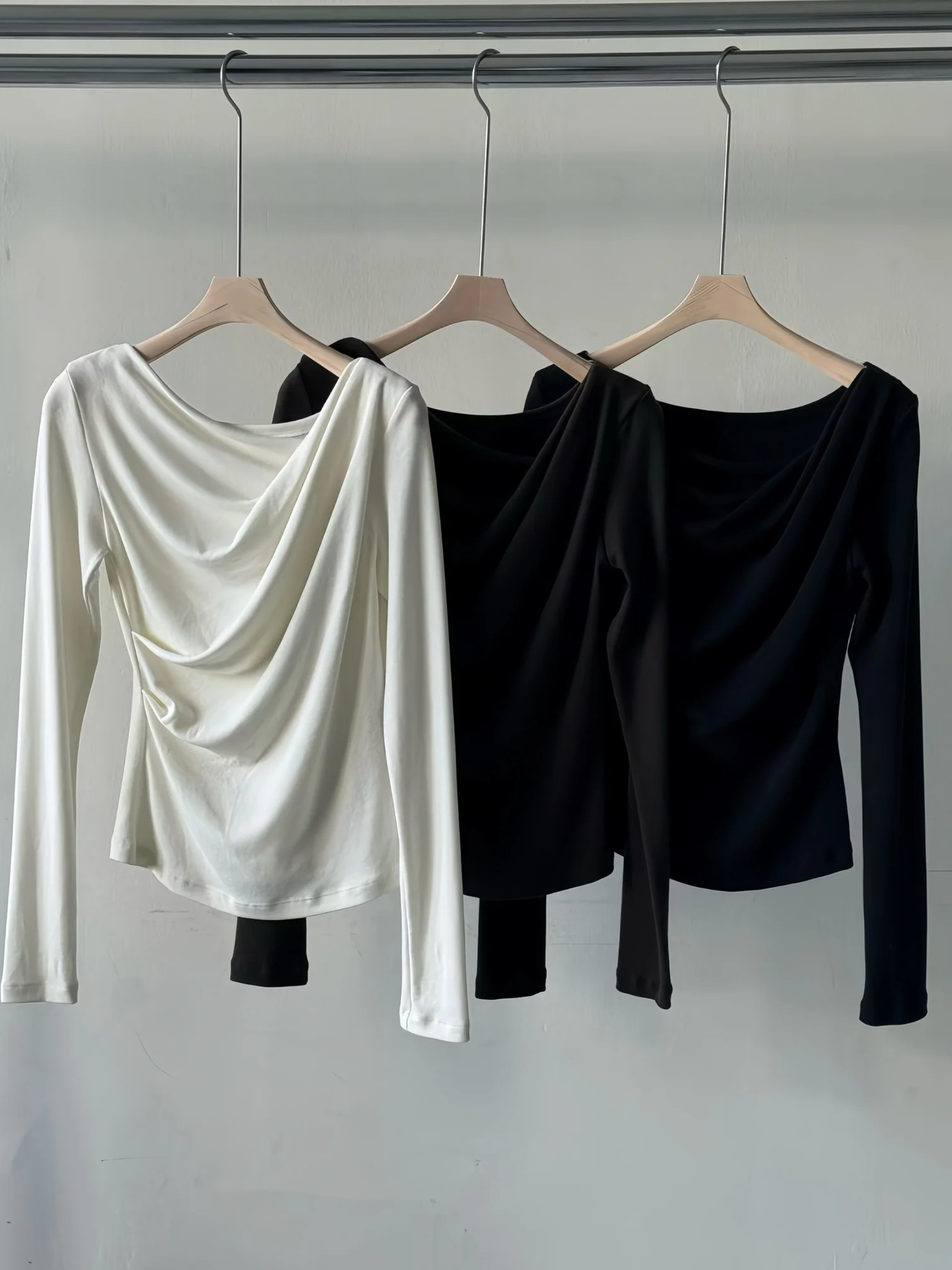 這款不對稱垂墜露肩長袖上衣,專為追求極致優雅與性感魅力的你而設計。它將法式的浪漫垂墜與修身剪裁完美結合,輕鬆穿出毫不費力的高級感。