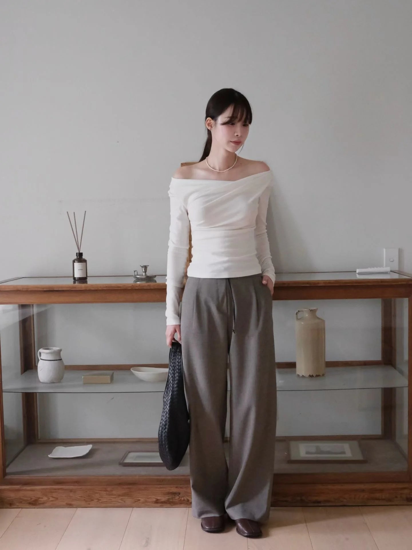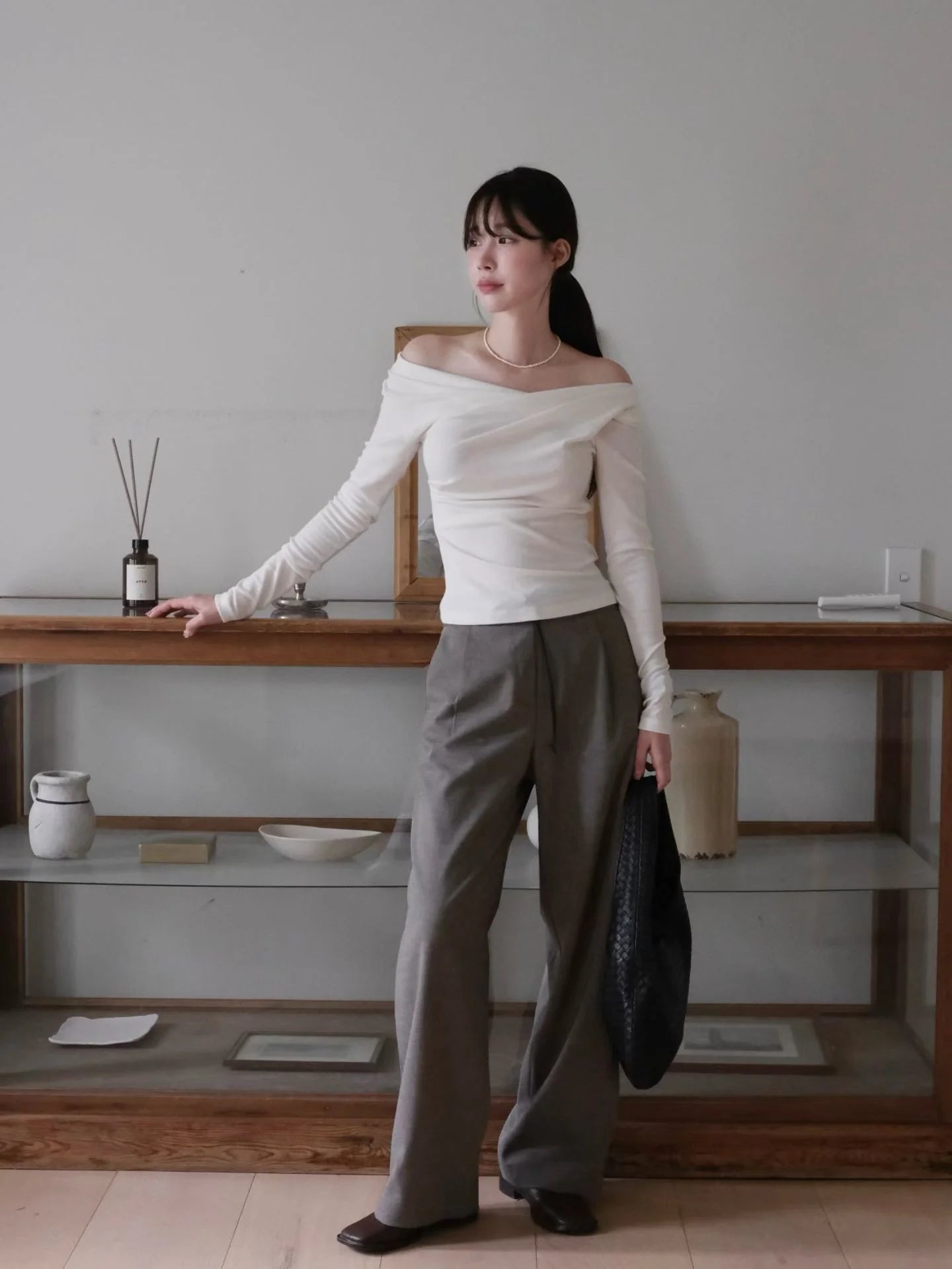 TP21986- 韓國法式優雅不對稱垂墜露肩上衣