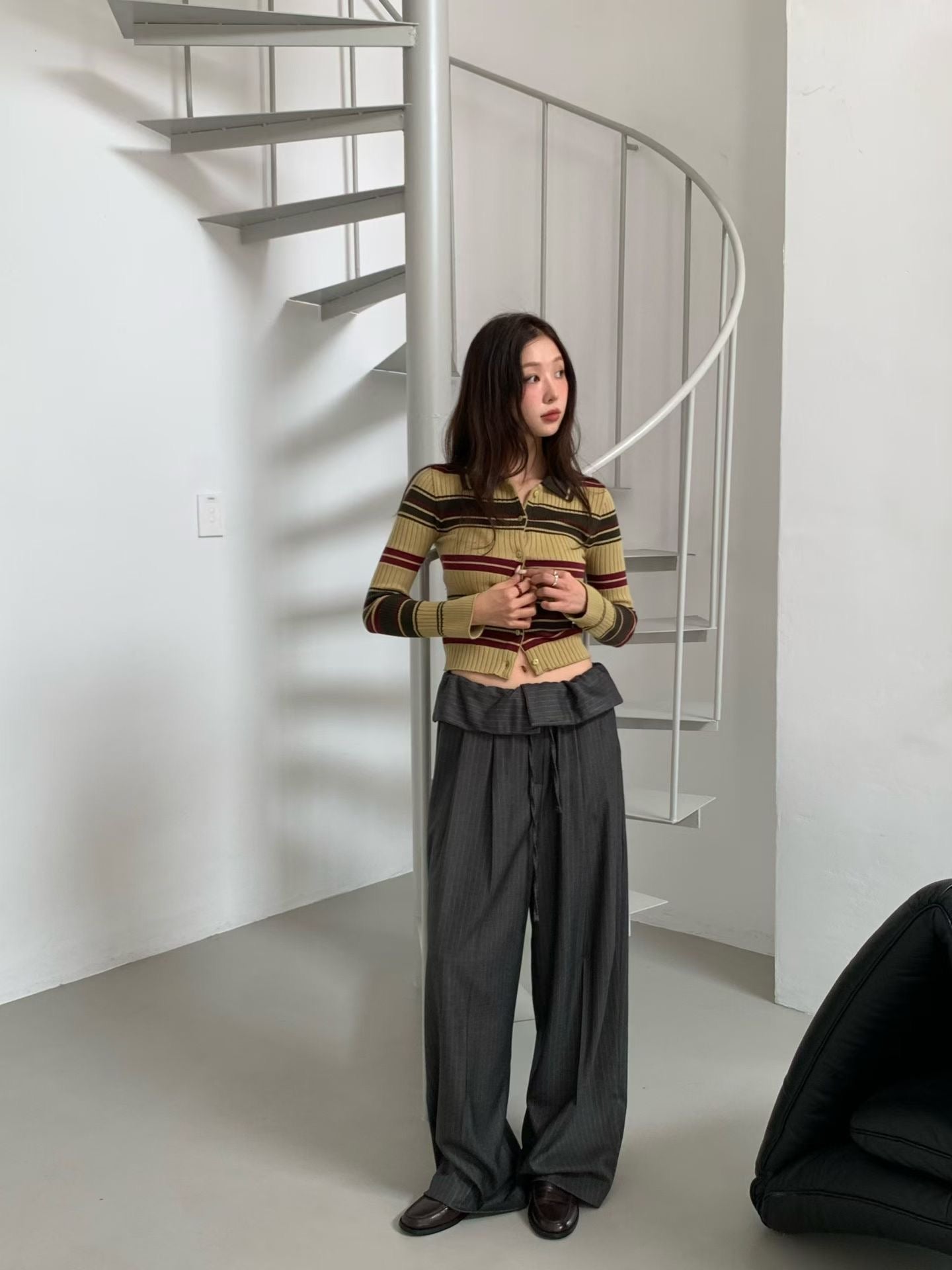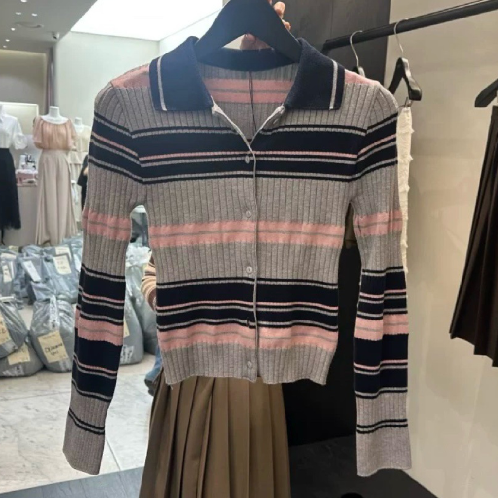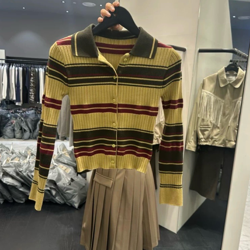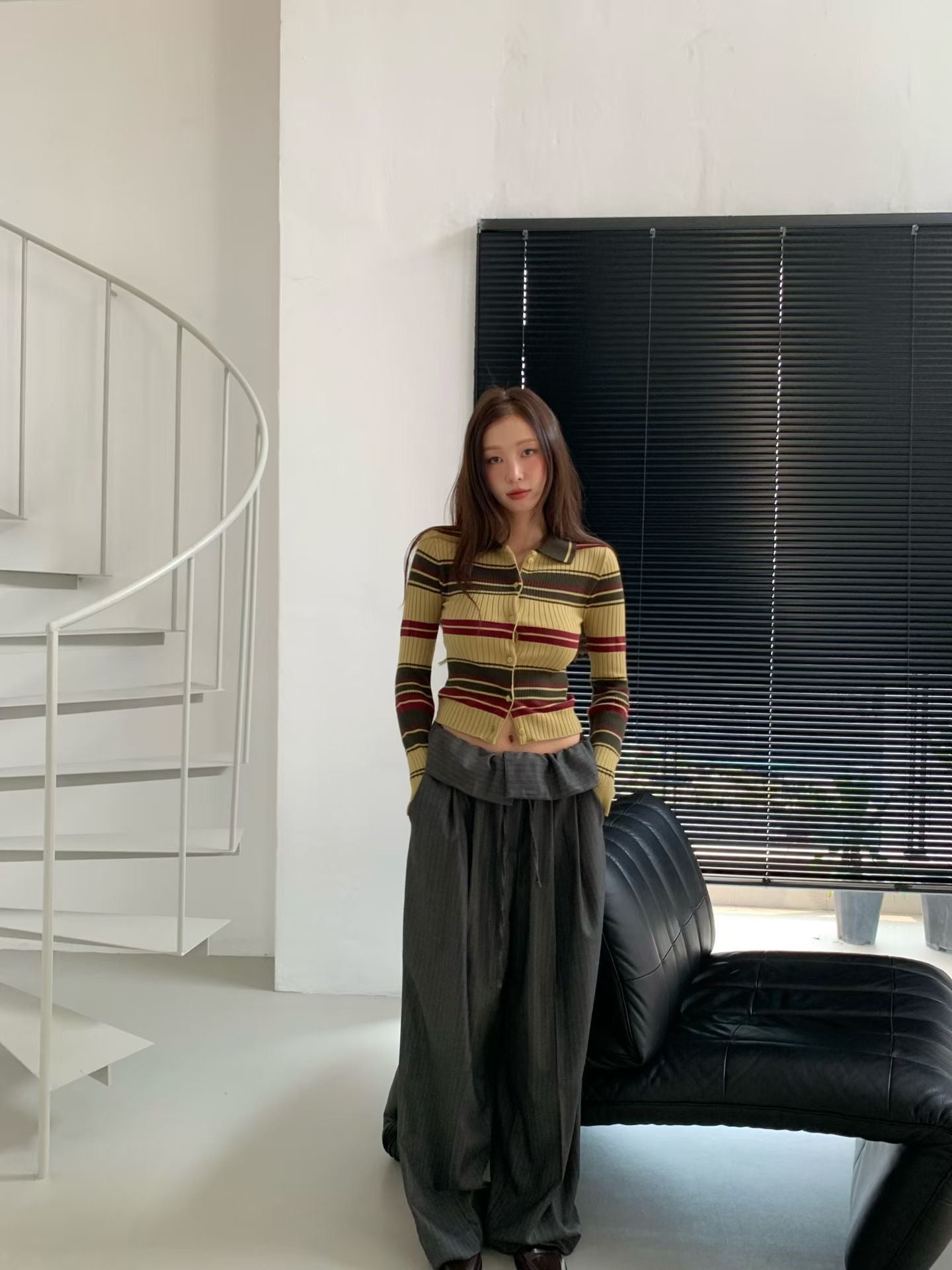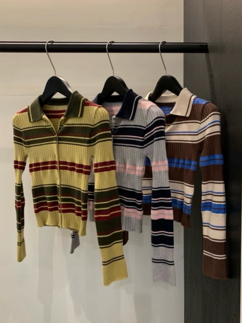 設計與質感: 開衫採用彈性羅紋針織面料,觸感柔軟親膚,能完美貼合身形,展現修長曲線。最獨特的設計在於大膽的多色撞色條紋,搭配POLO翻領修身短版剪裁,充滿復古活力與青春氣息。短版設計巧妙地拉高腰線,視覺上極為顯瘦。