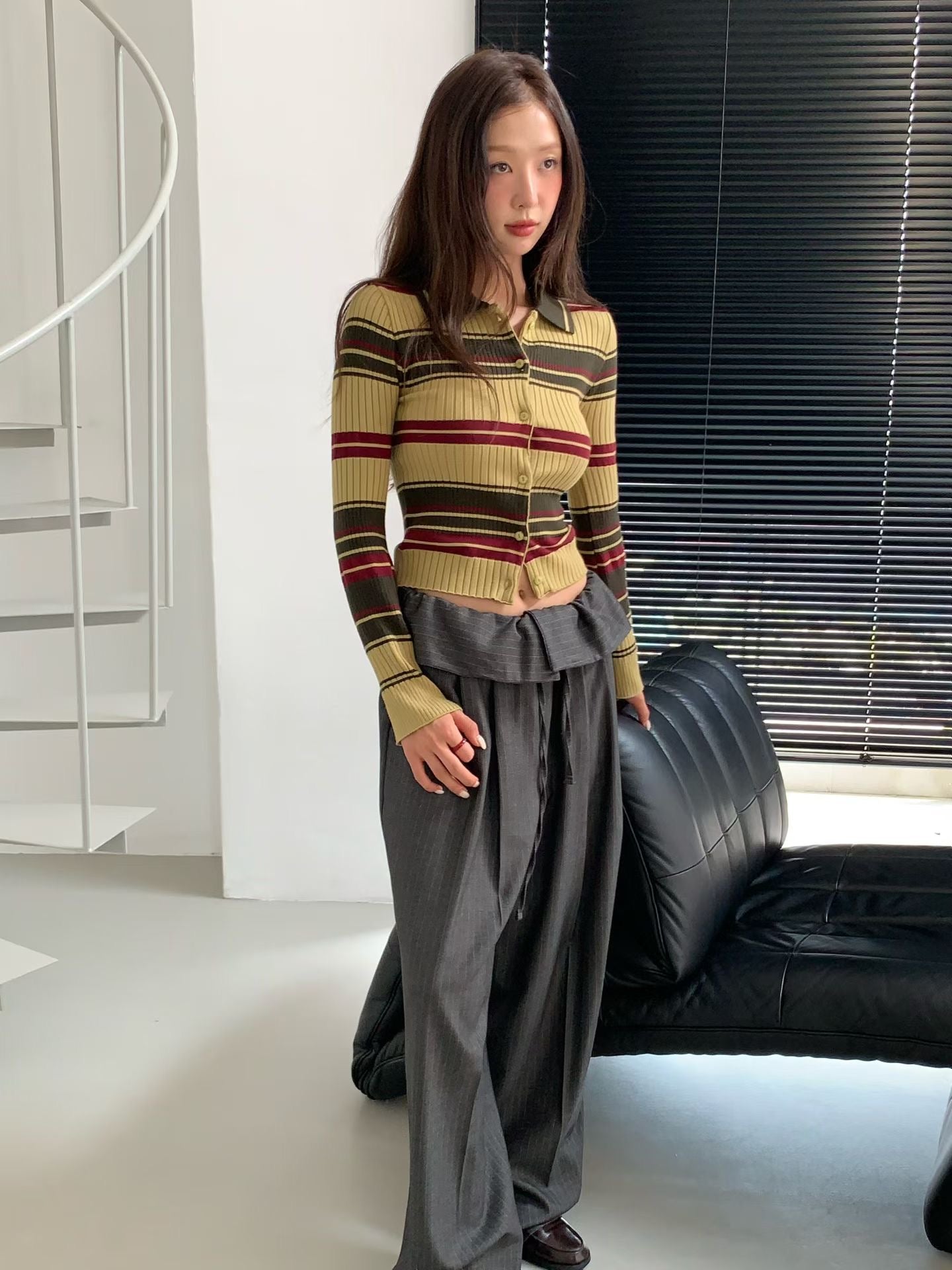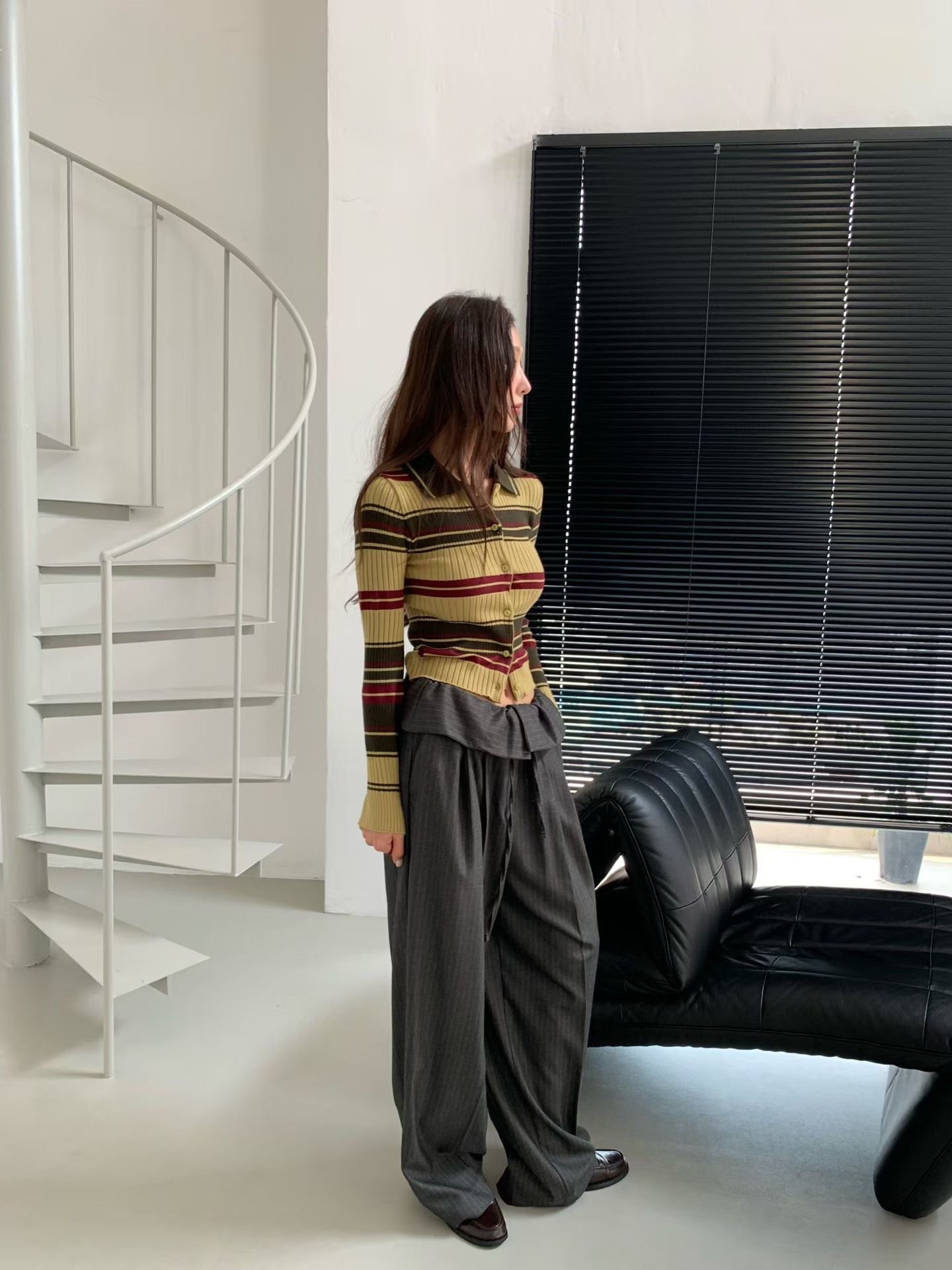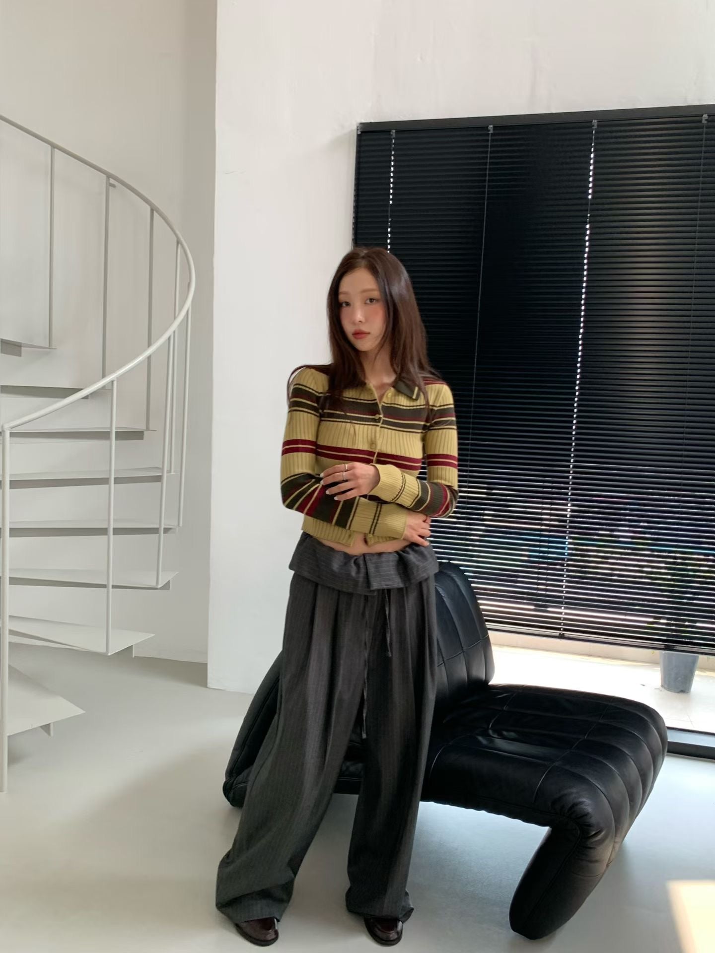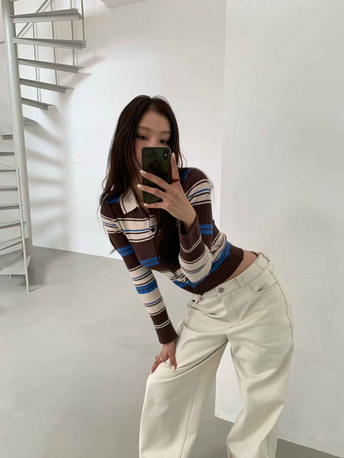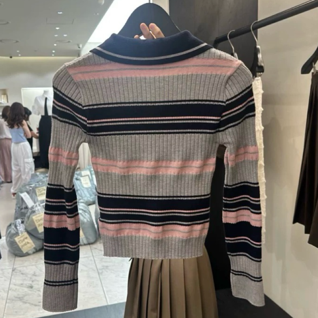 設計與質感: 開衫採用彈性羅紋針織面料,觸感柔軟親膚,能完美貼合身形,展現修長曲線。最獨特的設計在於大膽的多色撞色條紋,搭配POLO翻領修身短版剪裁,充滿復古活力與青春氣息。短版設計巧妙地拉高腰線,視覺上極為顯瘦。