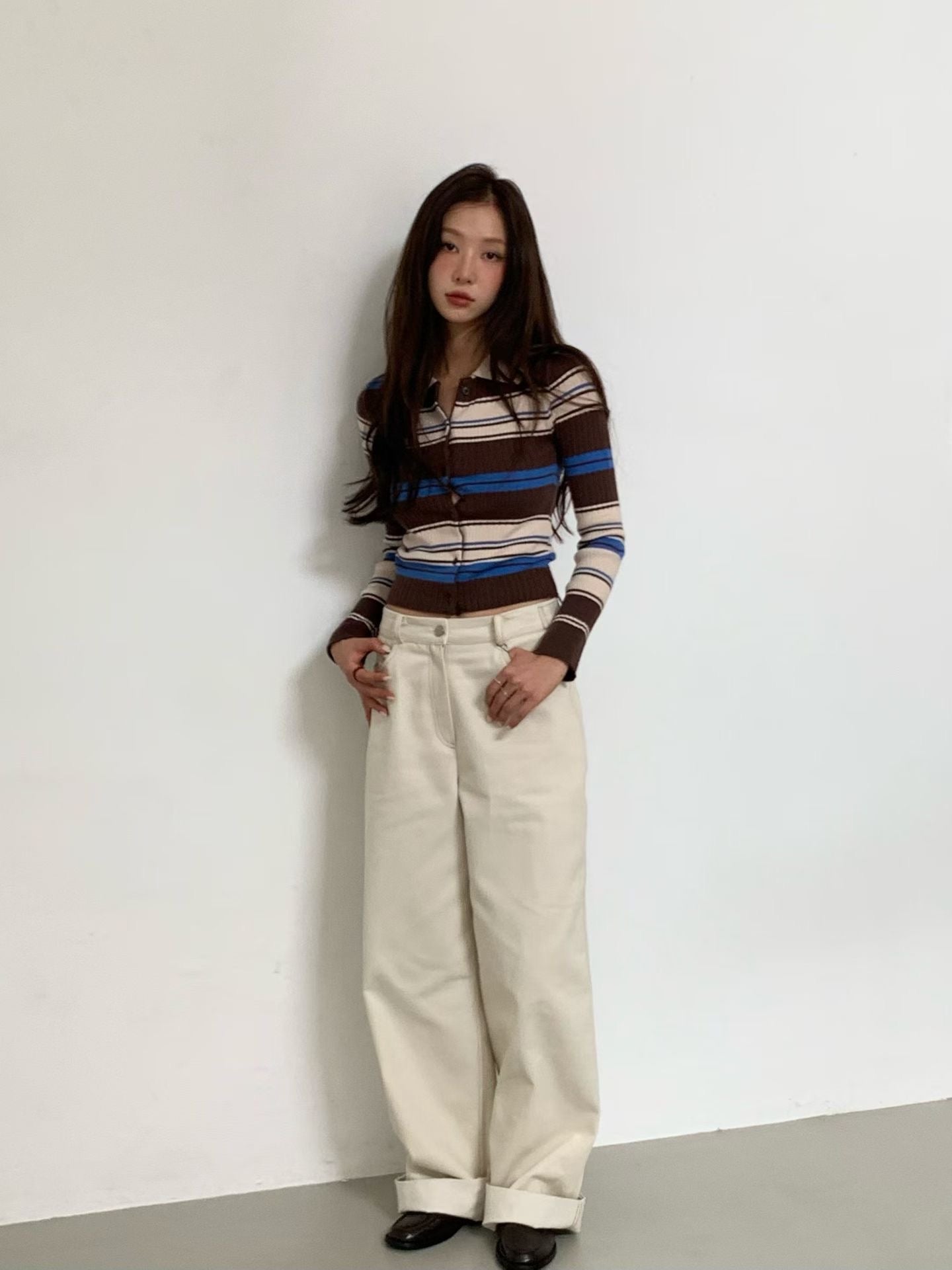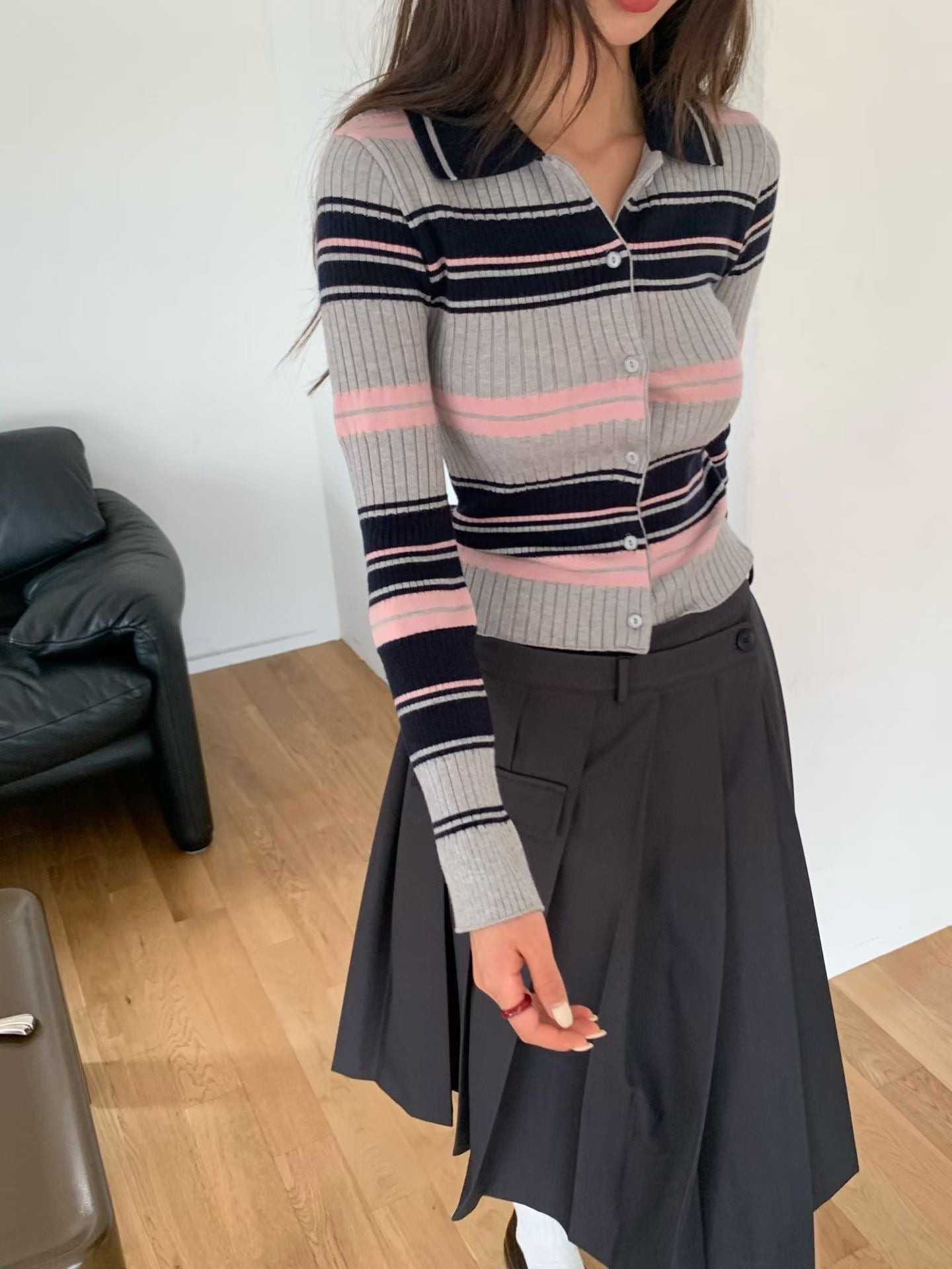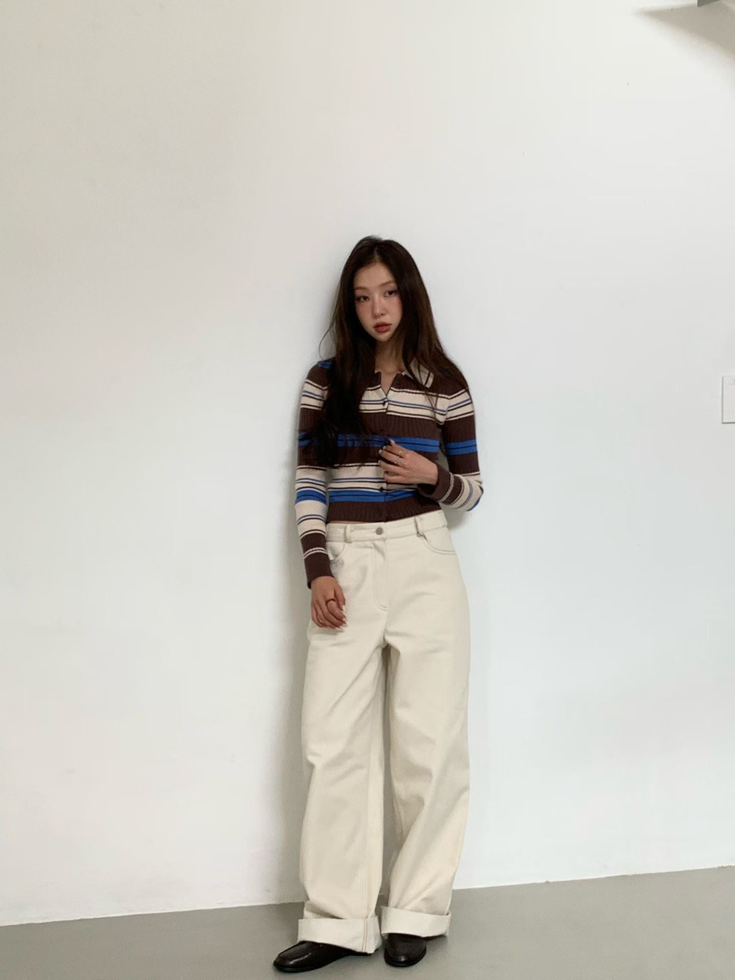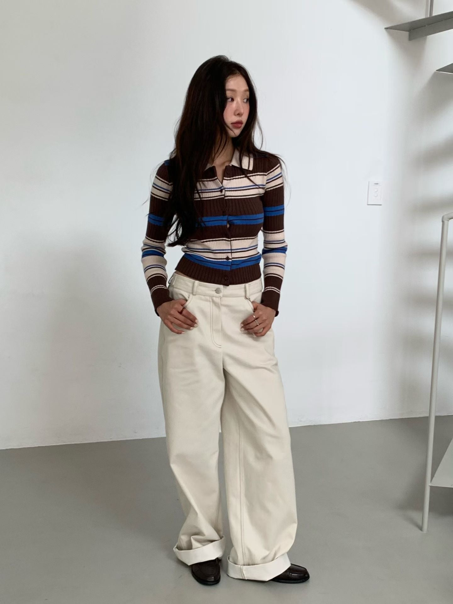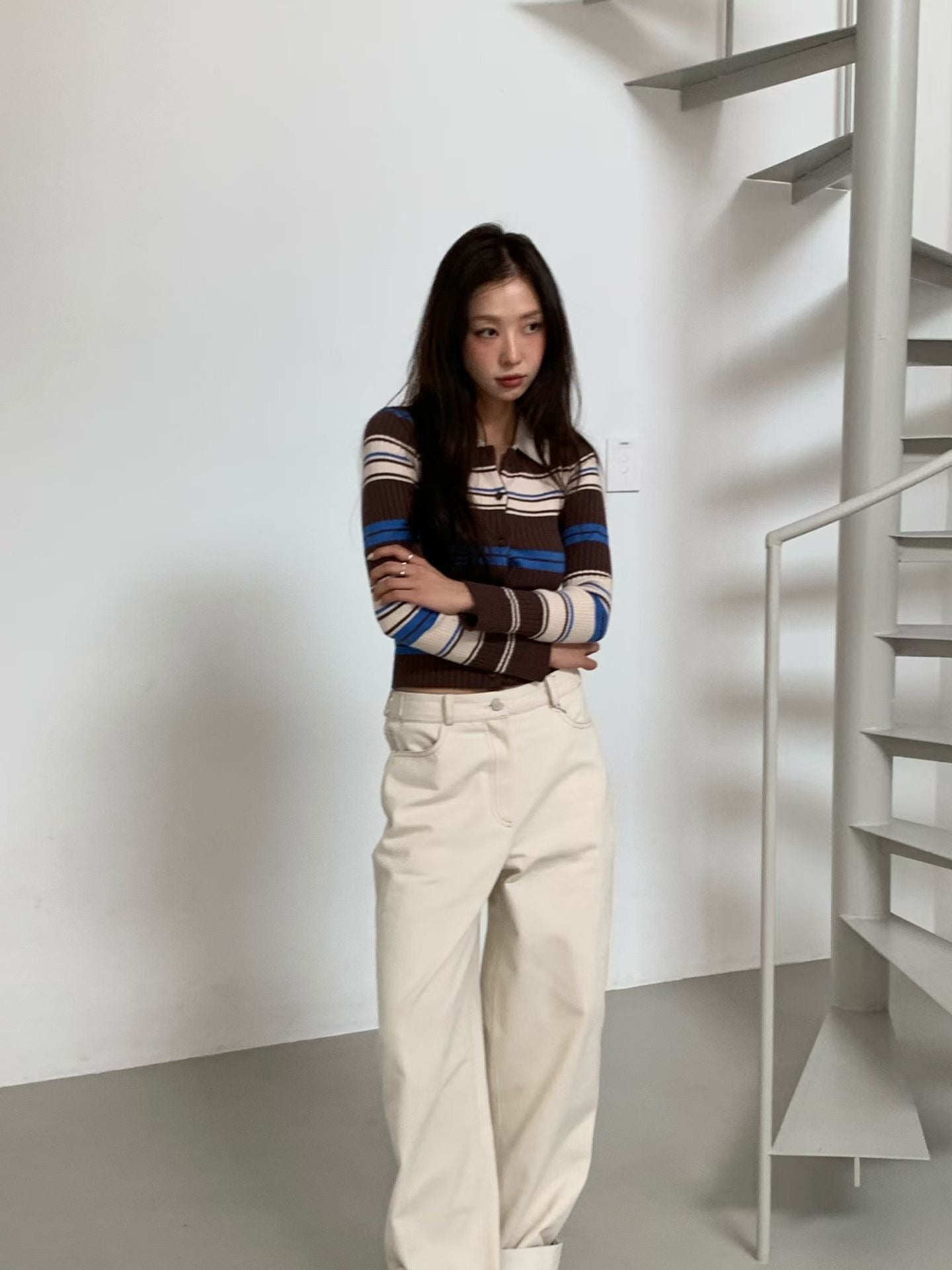 設計與質感: 開衫採用彈性羅紋針織面料,觸感柔軟親膚,能完美貼合身形,展現修長曲線。最獨特的設計在於大膽的多色撞色條紋,搭配POLO翻領修身短版剪裁,充滿復古活力與青春氣息。短版設計巧妙地拉高腰線,視覺上極為顯瘦。