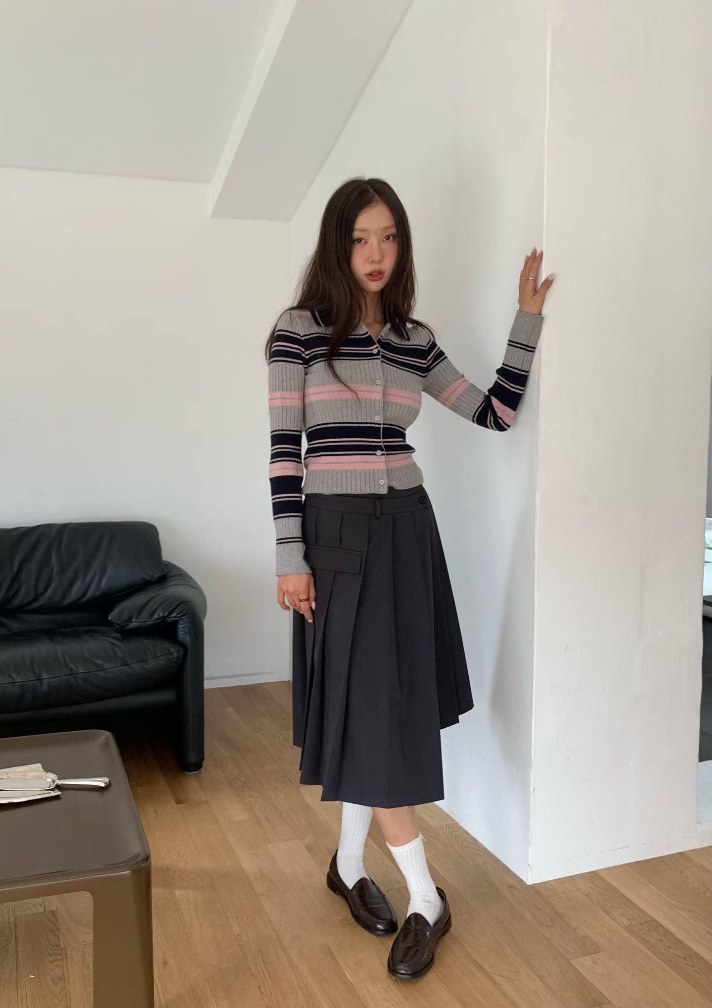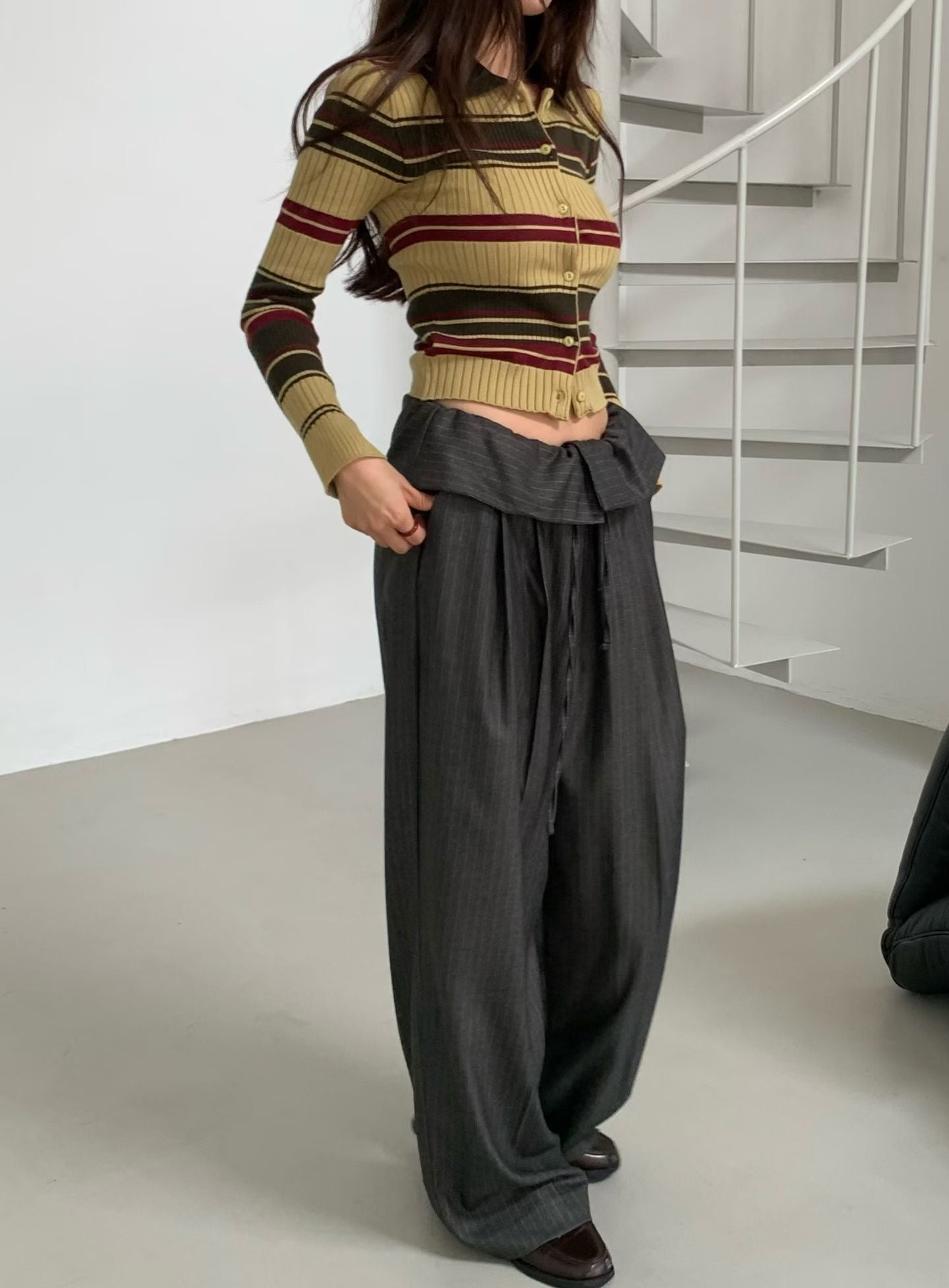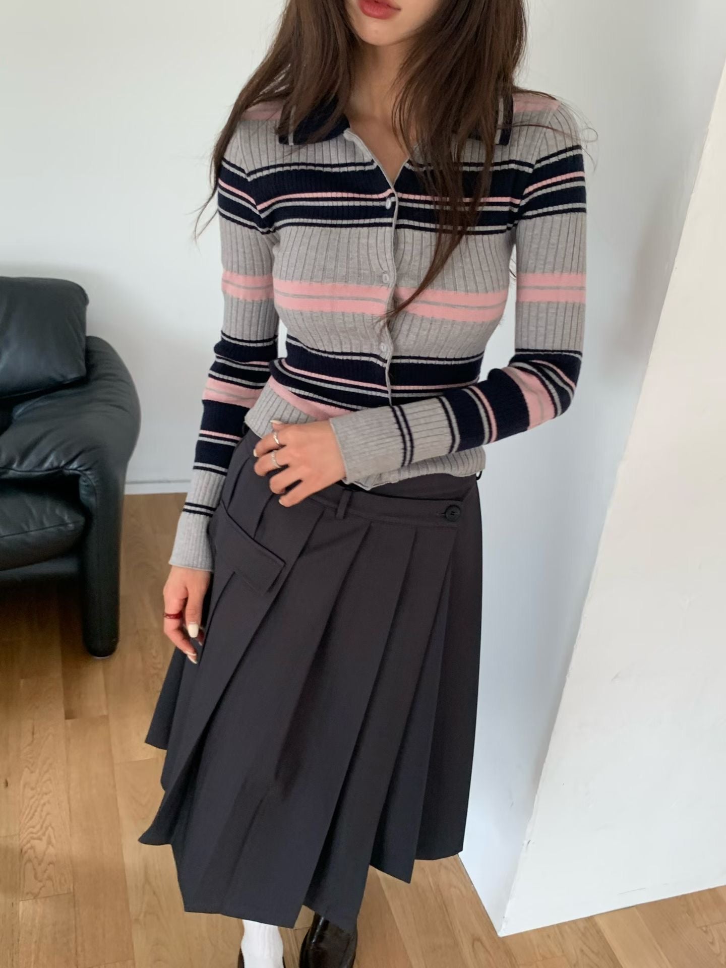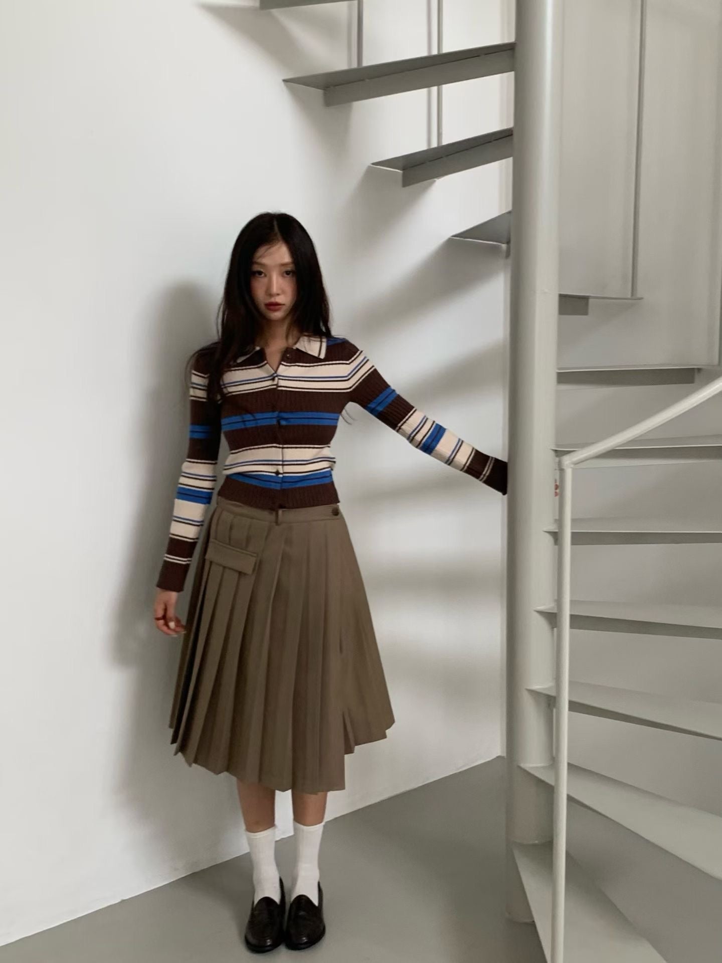 設計與質感: 開衫採用彈性羅紋針織面料,觸感柔軟親膚,能完美貼合身形,展現修長曲線。最獨特的設計在於大膽的多色撞色條紋,搭配POLO翻領修身短版剪裁,充滿復古活力與青春氣息。短版設計巧妙地拉高腰線,視覺上極為顯瘦。