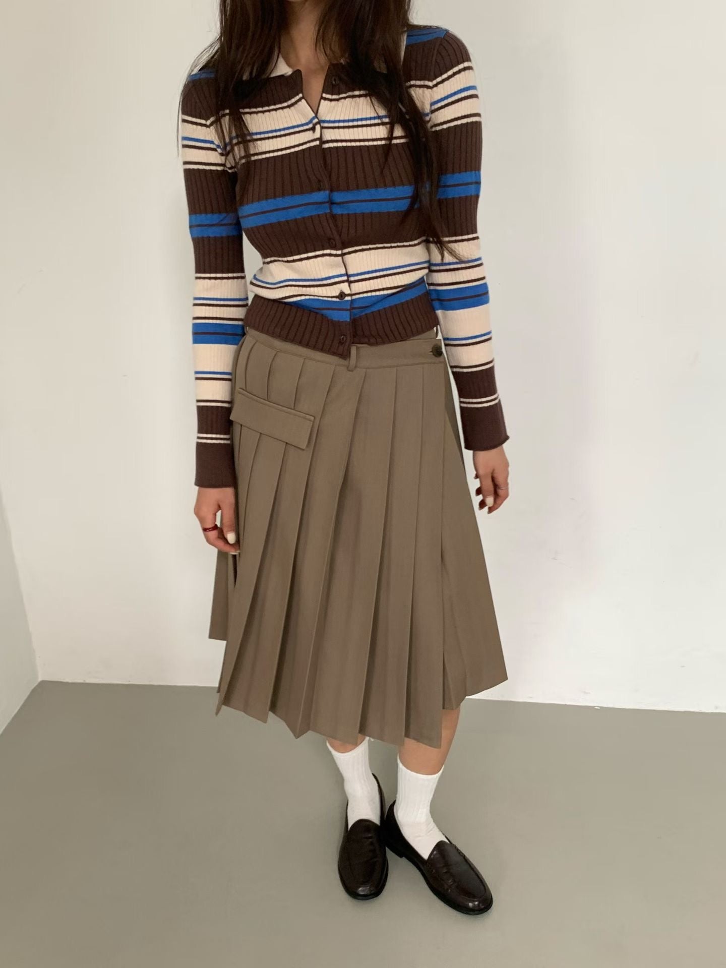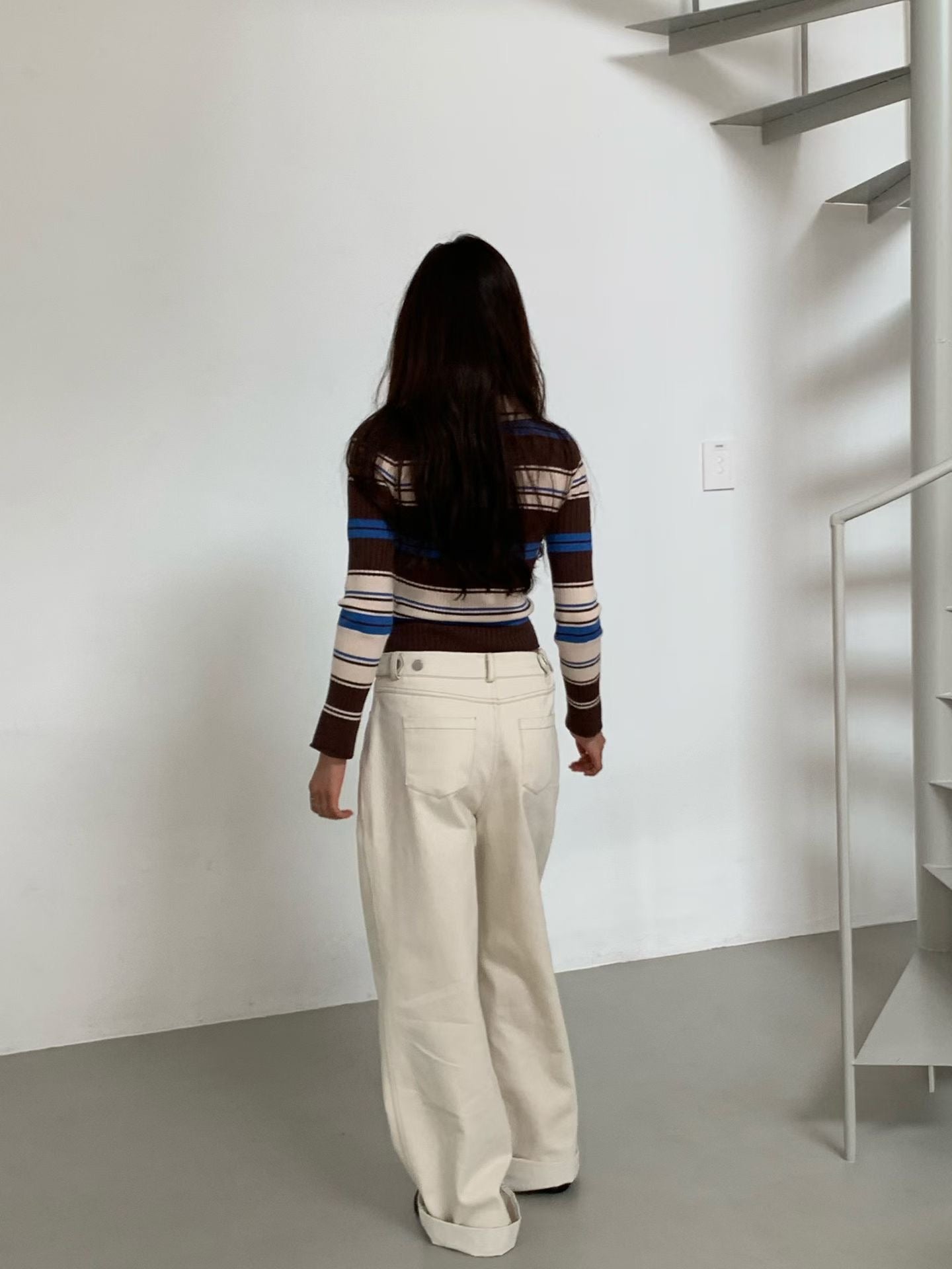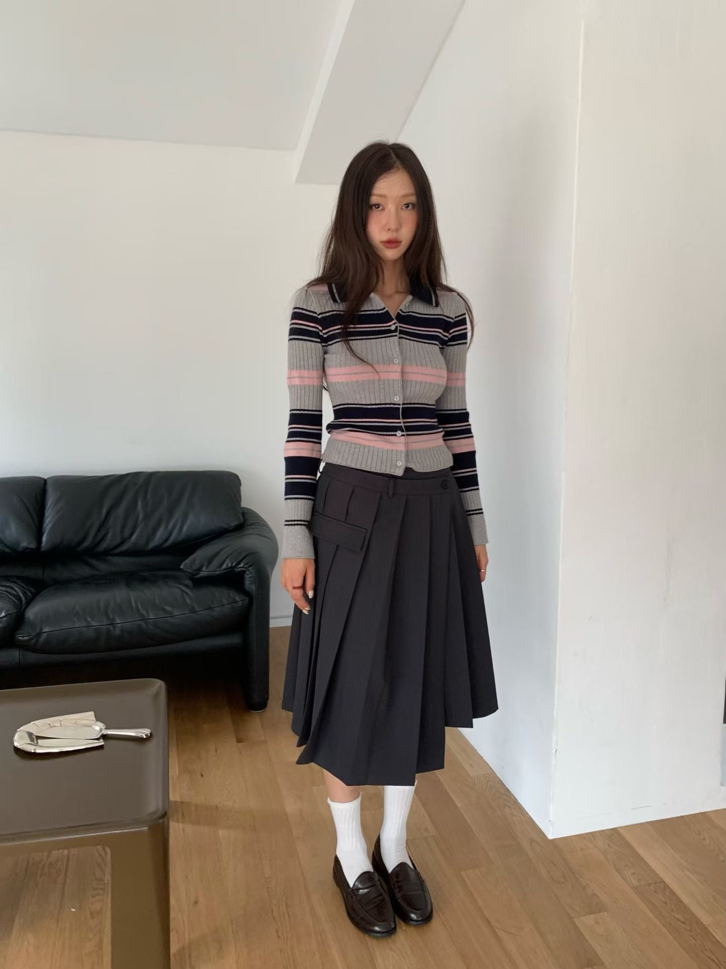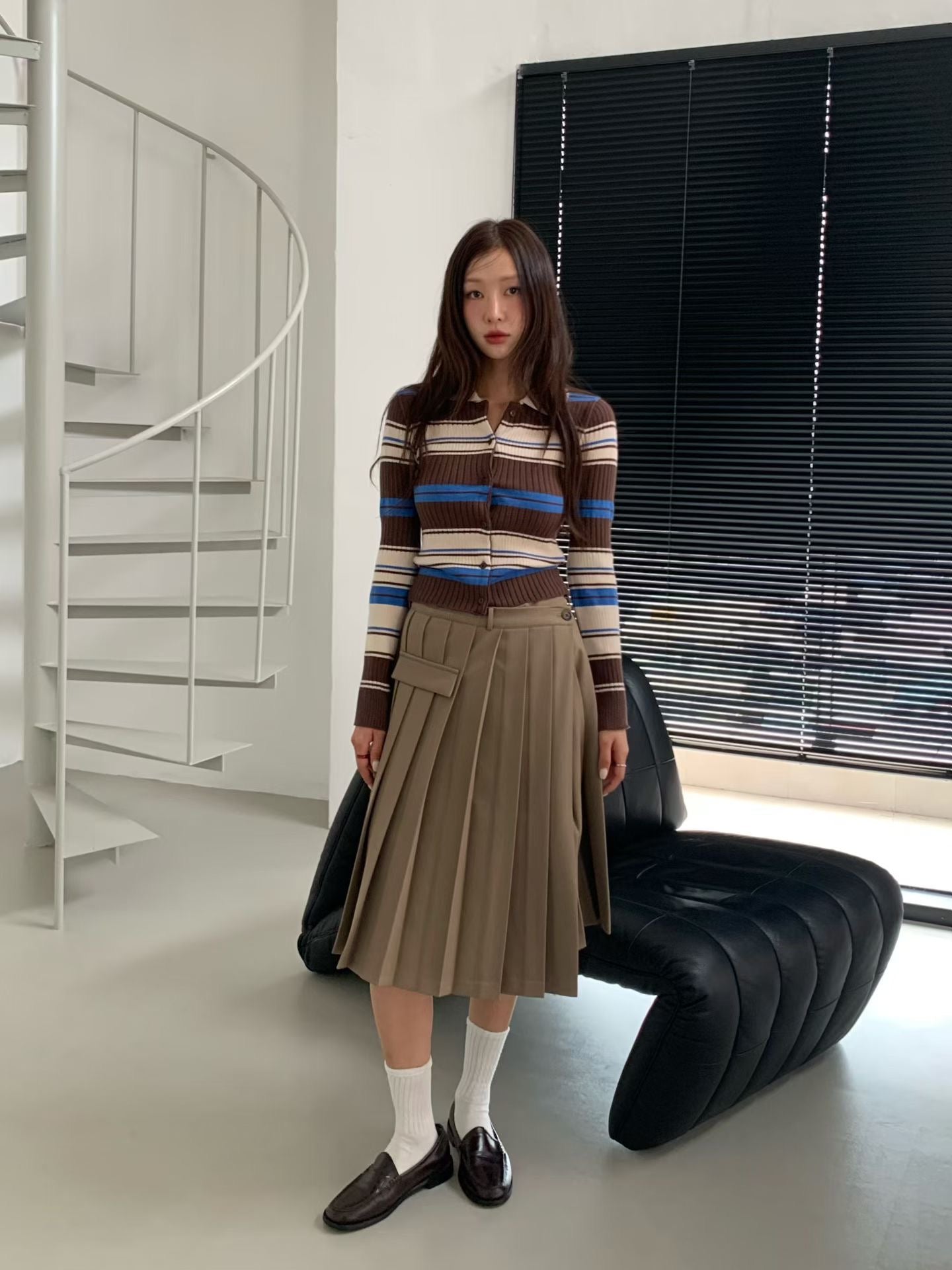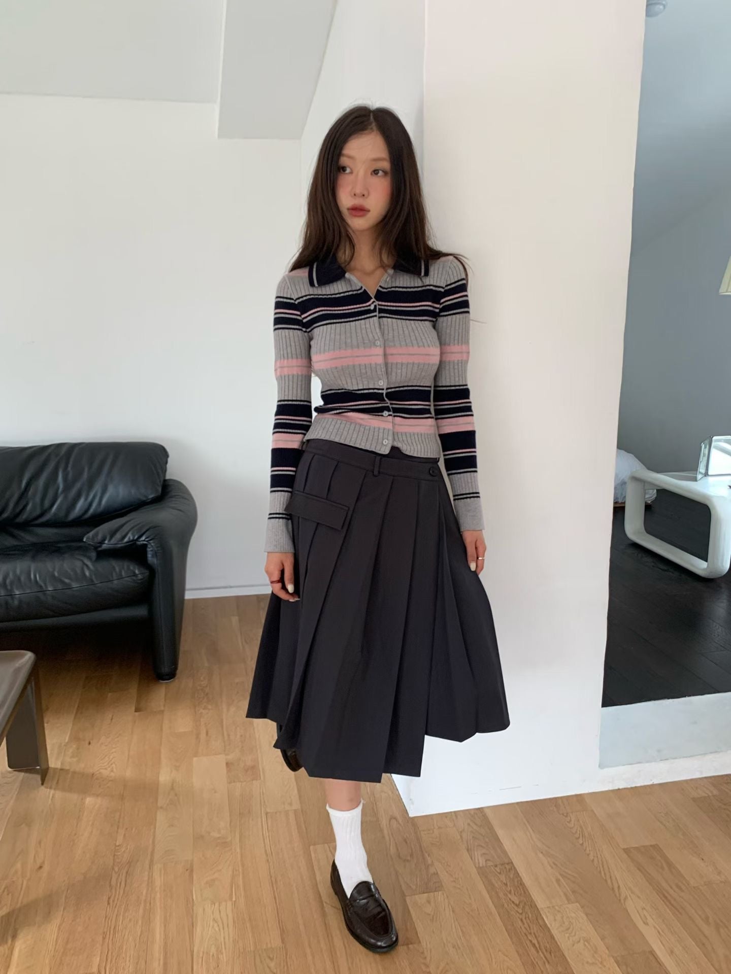 設計與質感: 開衫採用彈性羅紋針織面料,觸感柔軟親膚,能完美貼合身形,展現修長曲線。最獨特的設計在於大膽的多色撞色條紋,搭配POLO翻領修身短版剪裁,充滿復古活力與青春氣息。短版設計巧妙地拉高腰線,視覺上極為顯瘦。