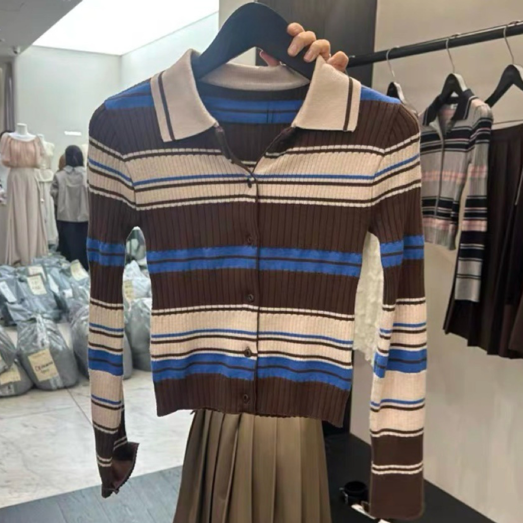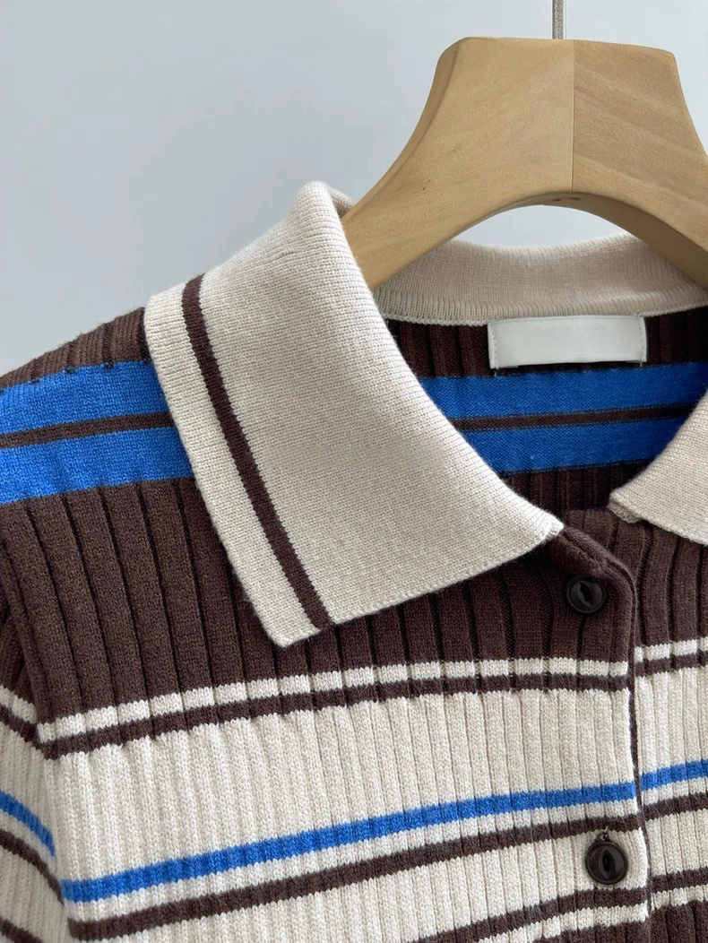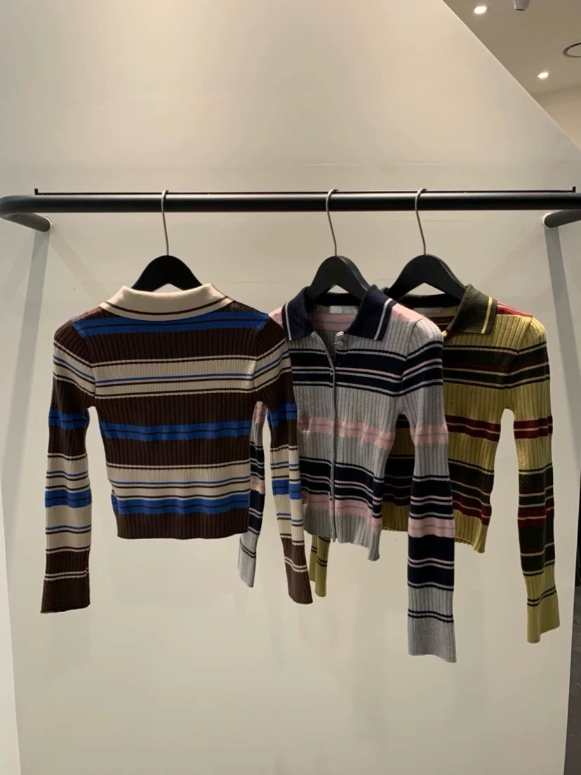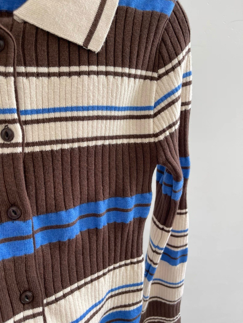 TP22006- 韓國短身復古修身撞色條紋毛衣針織開襟衫