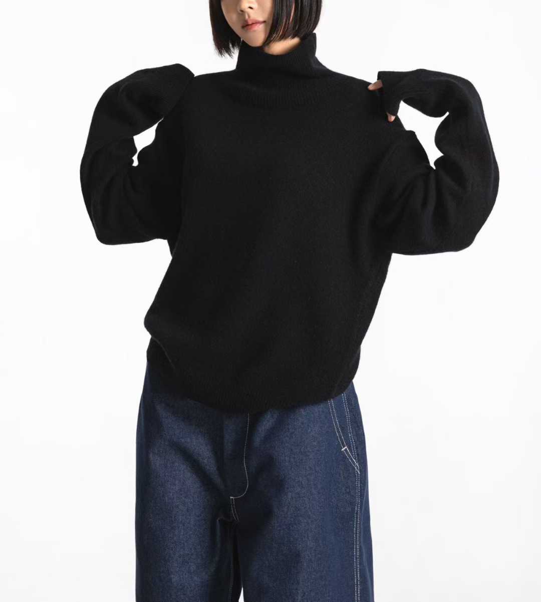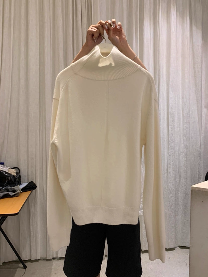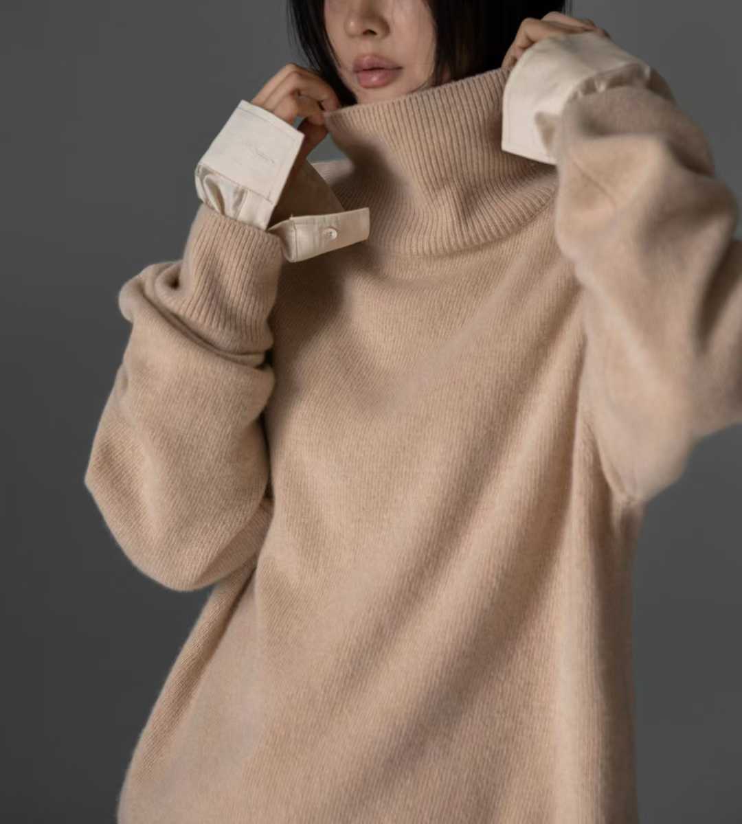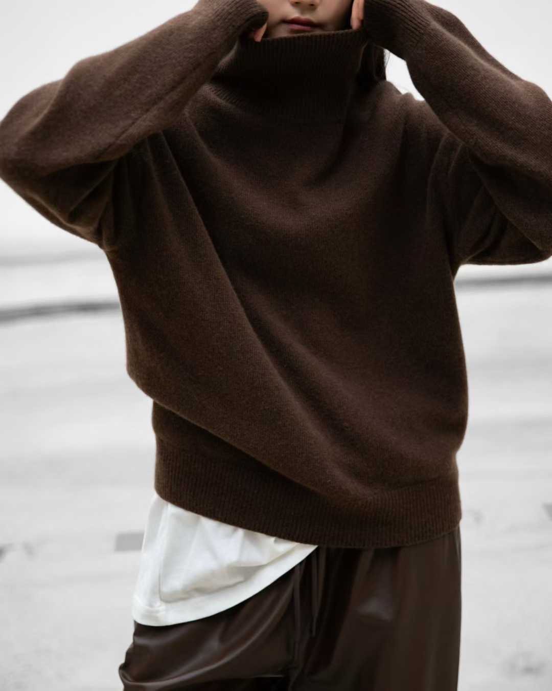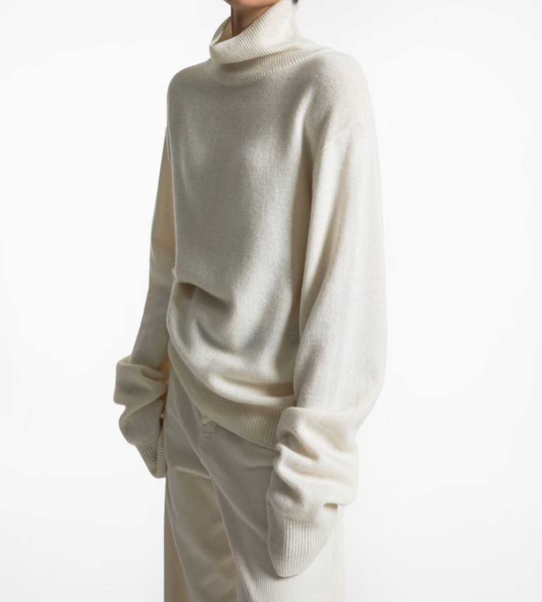 設計與風格: 經典的**堆堆領(高領)**設計,溫柔修飾頸部線條,同時有效防風保暖。寬鬆慵懶的版型與恰到好處的衣長,無論是將下襬紮進褲子裡,或自然垂墜,都能營造出毫不費力的隨性高級感。