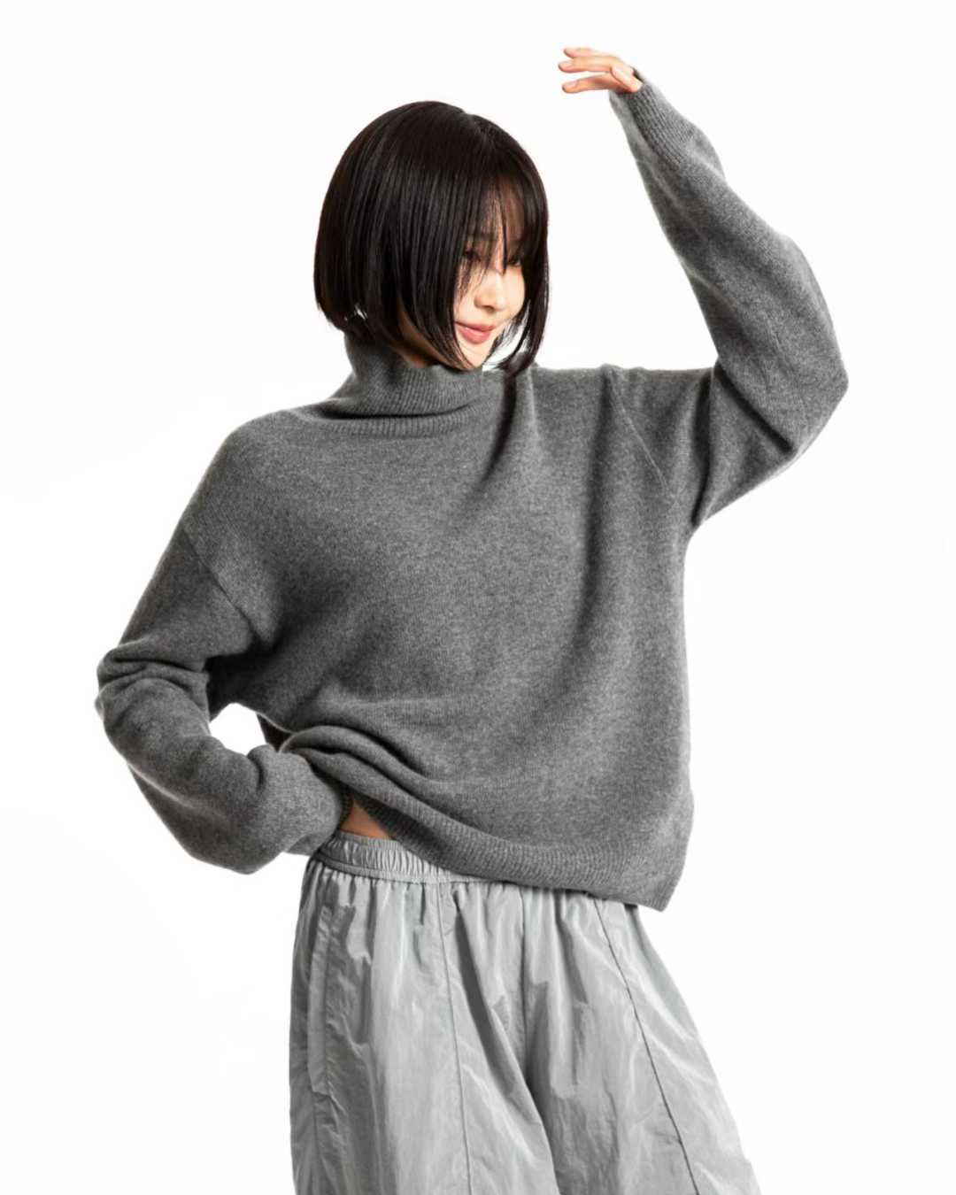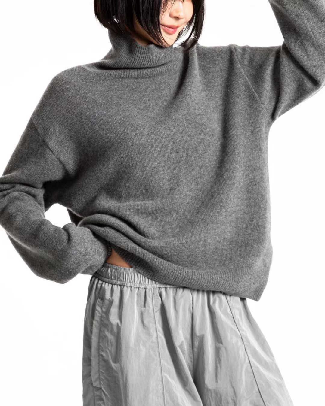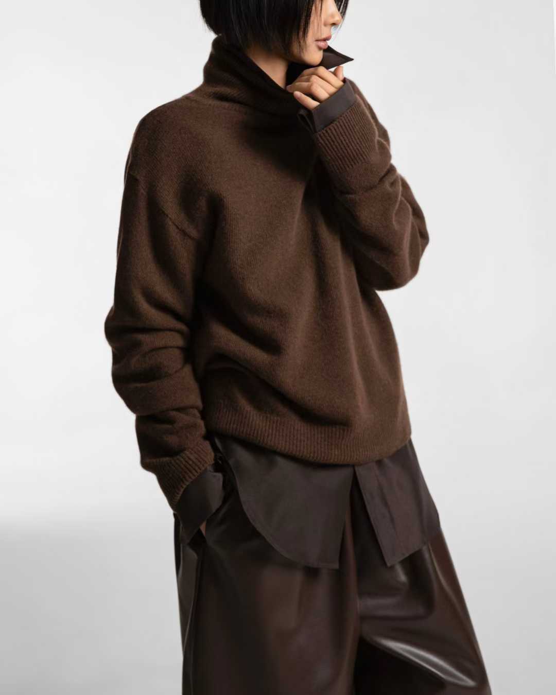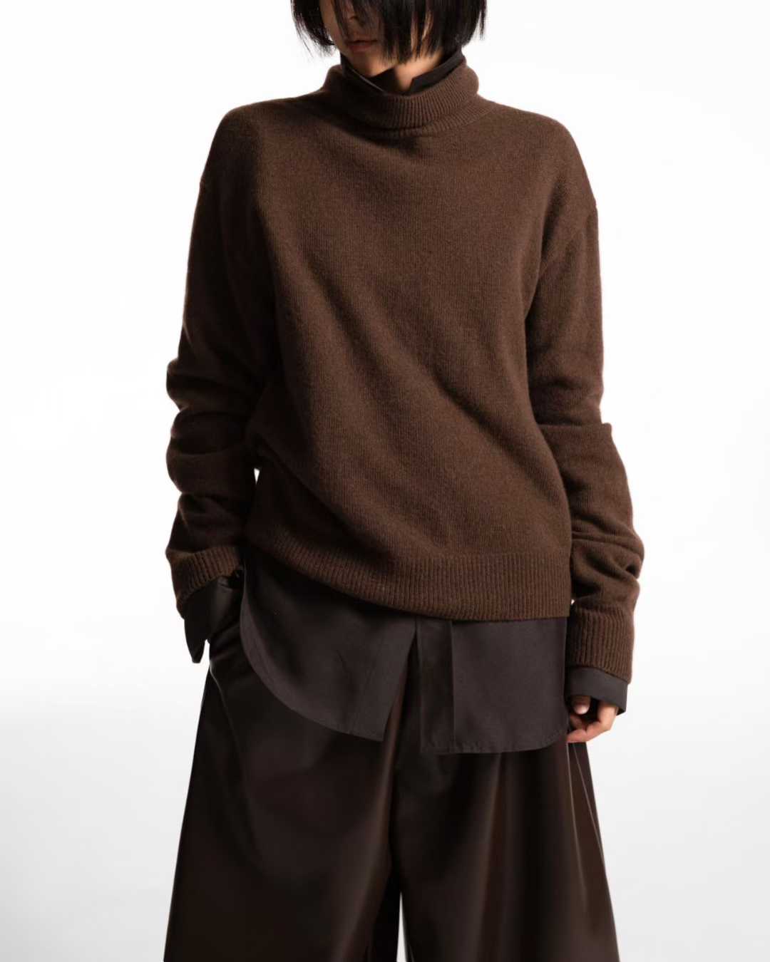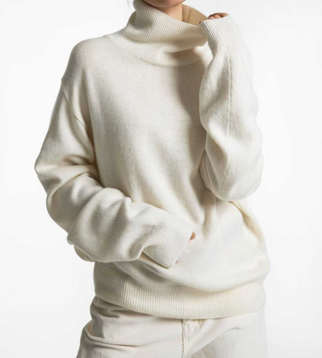 設計與風格: 經典的**堆堆領(高領)**設計,溫柔修飾頸部線條,同時有效防風保暖。寬鬆慵懶的版型與恰到好處的衣長,無論是將下襬紮進褲子裡,或自然垂墜,都能營造出毫不費力的隨性高級感。