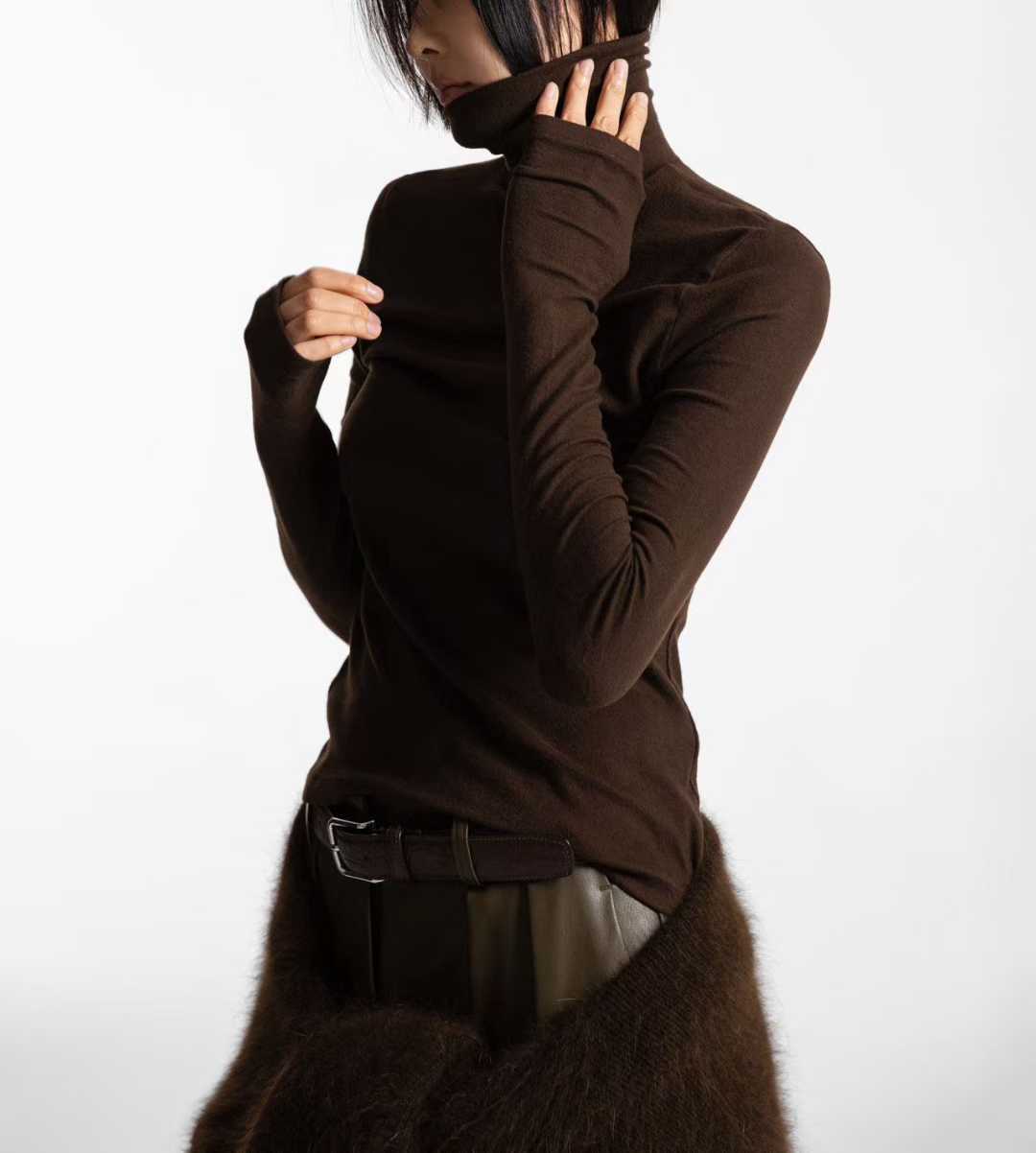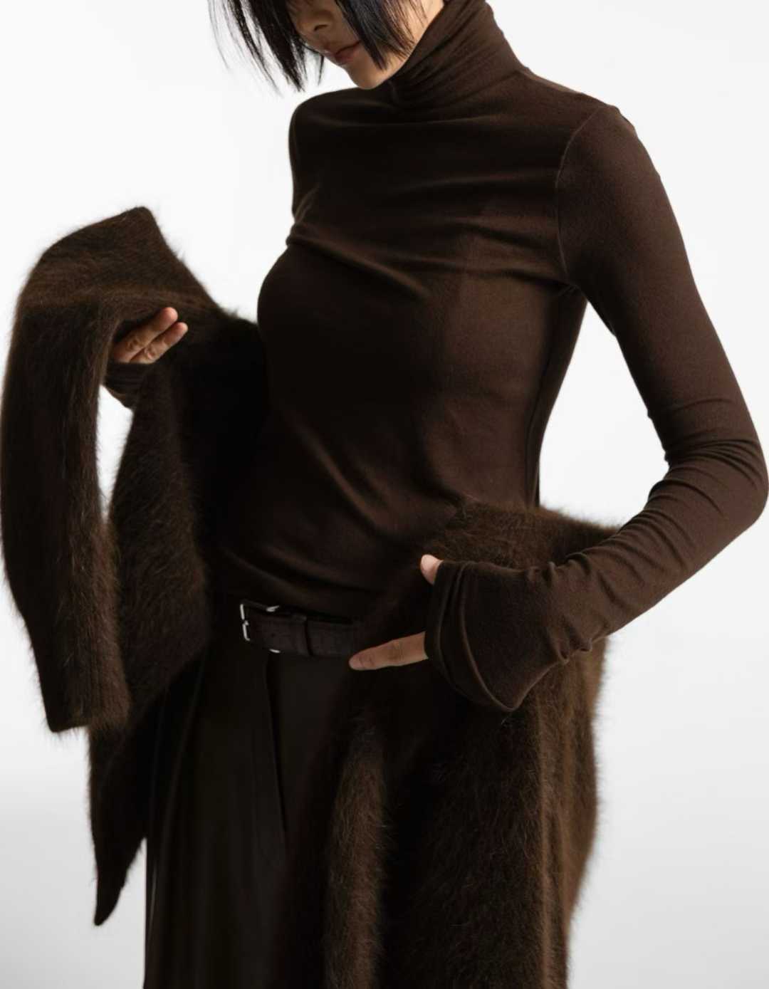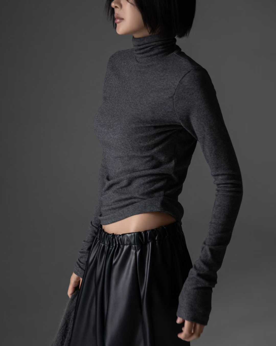 設計與穿搭: 經典的堆堆領/高領設計不僅能有效防風保暖,更顯臉部線條修長。超長袖子設計可隨性堆疊或拉下遮蓋手部,細節處充滿設計巧思。修身剪裁使其作為內搭時平整俐落,單穿時則展現優雅的極簡風格。