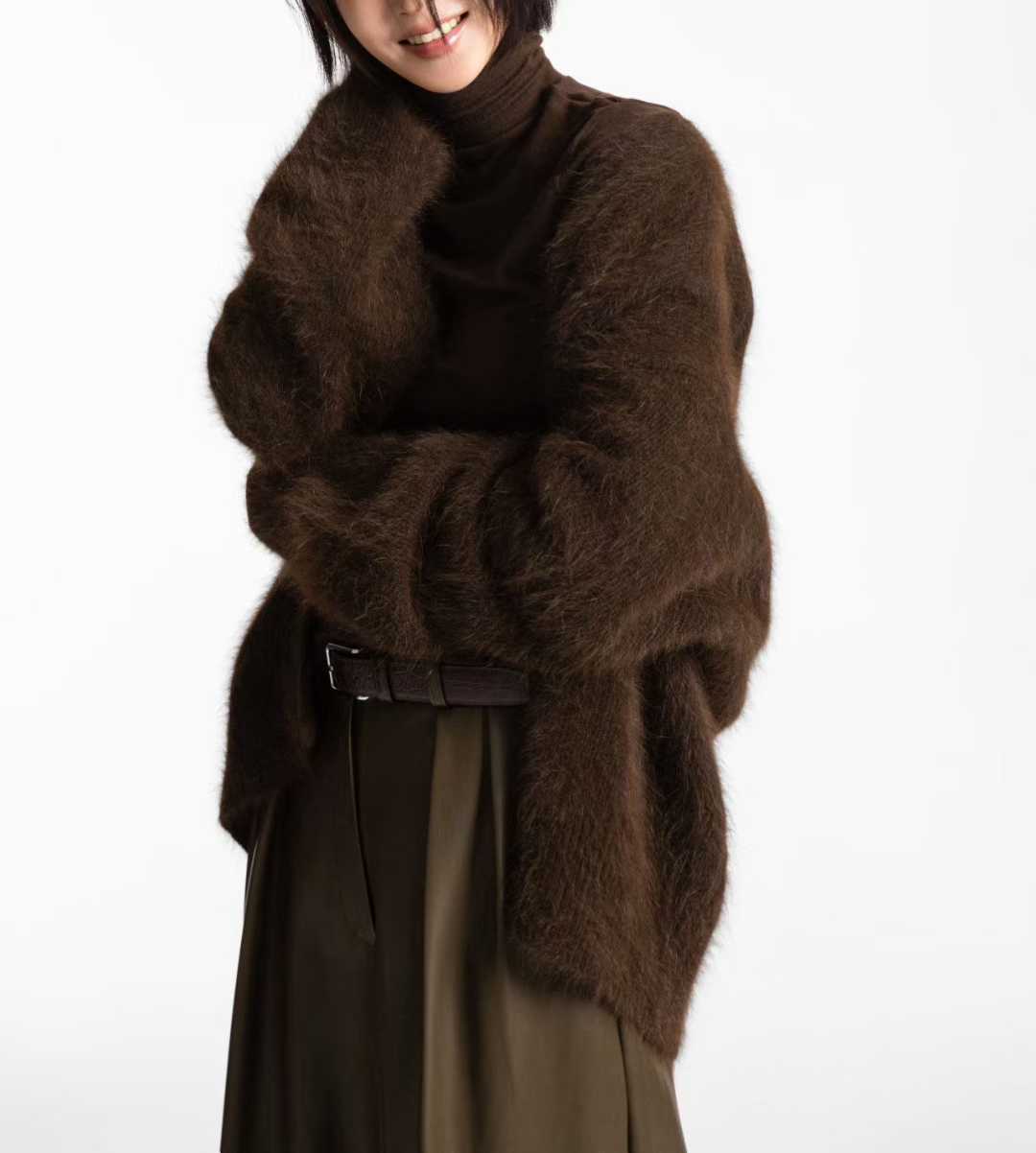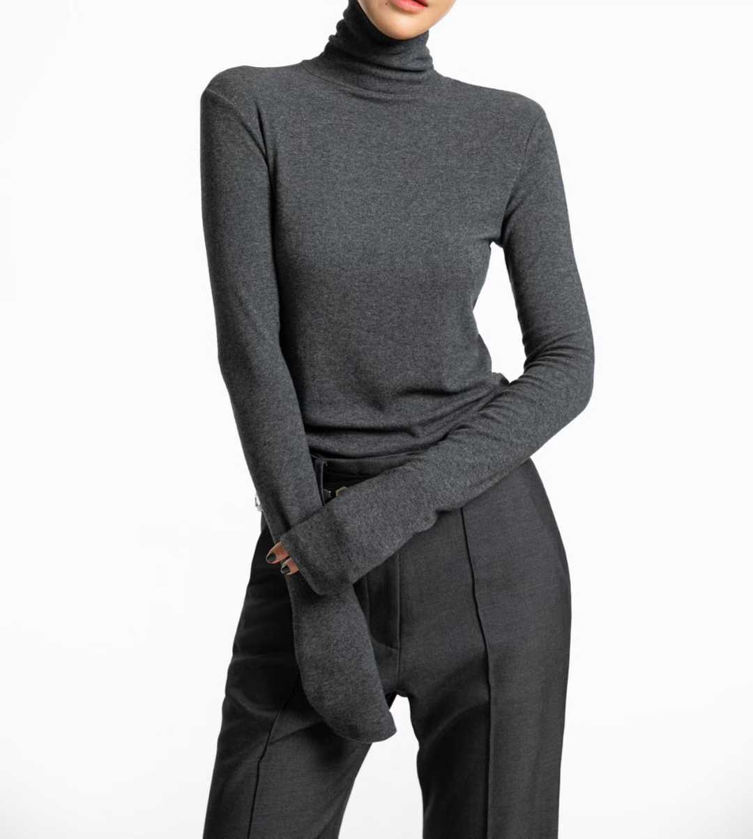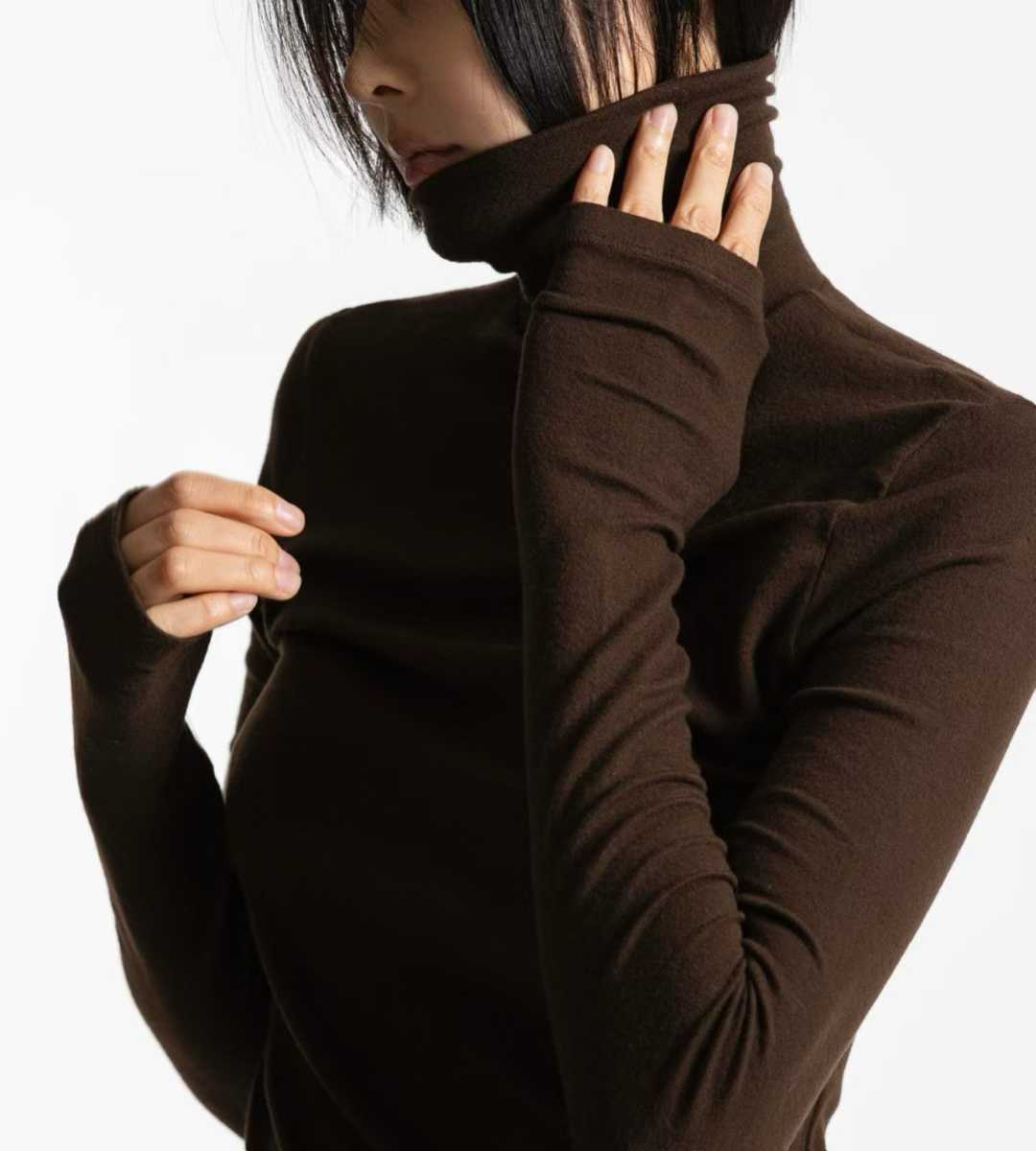 設計與穿搭: 經典的堆堆領/高領設計不僅能有效防風保暖,更顯臉部線條修長。超長袖子設計可隨性堆疊或拉下遮蓋手部,細節處充滿設計巧思。修身剪裁使其作為內搭時平整俐落,單穿時則展現優雅的極簡風格。